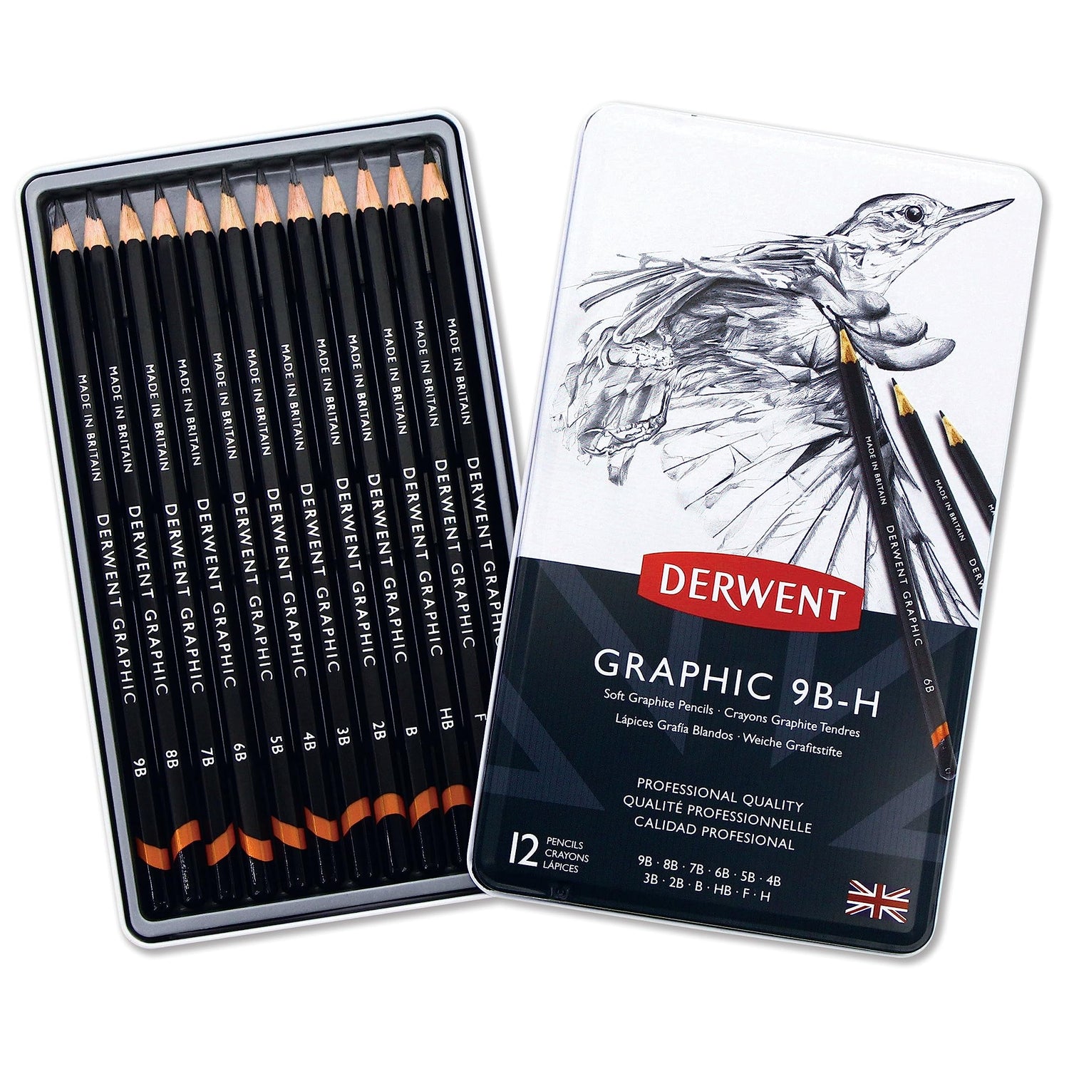 Details: Derwent Graphic Pencils are a professional quality product that anyone can use. With the hexagonal barrel, you gain greater precision for detailed drawings. The hard (H) degrees contain a 2.2 mm core for sharp, fine lines, while the black (B) soft degrees use a 3.5mm core to obtain softer lines. Be prepared for any project and choose the pencil that works for you. Derwent offers a comprehensive range of 20 degrees to help you achieve your vision. This set contains 6B, 5B, 4B, 3B, 2B, B, HB, F, H, 9B, 8B and 7B in a metal tin. Whether used for blending, fine detailed illustrations or shading and depth, these pencils will help you express your vision. The core sharpens to a fine, long-lasting point, great for emphasizing even the smallest details. The fine point allows for professional-level precision on your most intricate images. With a heritage dating to 1832, Derwent’s innovation comes from an understanding of artists. We’ve produced a range of quality art materials, many of which are made in our British manufacturing plant.