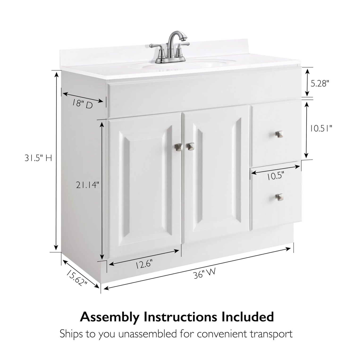Details: The Design House Wyndham Fully Assembled Vanity features a durable white finish and satin nickel knob hardware. Perfect for any style home, this vanity has clean lines and concealed hinges. The 2-door, 2-drawer construction gives you plenty of storage for toiletries to keep your countertop free of clutter. Easily add an additional shelf inside this cabinet for even more storage. Measuring 36-inch by 18-inch by 31.5-inch and accommodating a vanity top measuring 37-inches by 19-inches, this vanity can fit into any small or medium-sized bathroom while still providing ample storage space. Traditional construction meshes with subtle modern details to quickly brighten up your bathroom. This product is perfect for remodeling your bathroom and matches granite countertops and colored walls.This vanity cabinet is fully assembled for a hassle-free installation process. It is assembled in the USA and packaged with care. Manufactured by Design House, the trusted source for quality lighting, hardware, plumbing, kitchen, and bath products for every taste and budget.