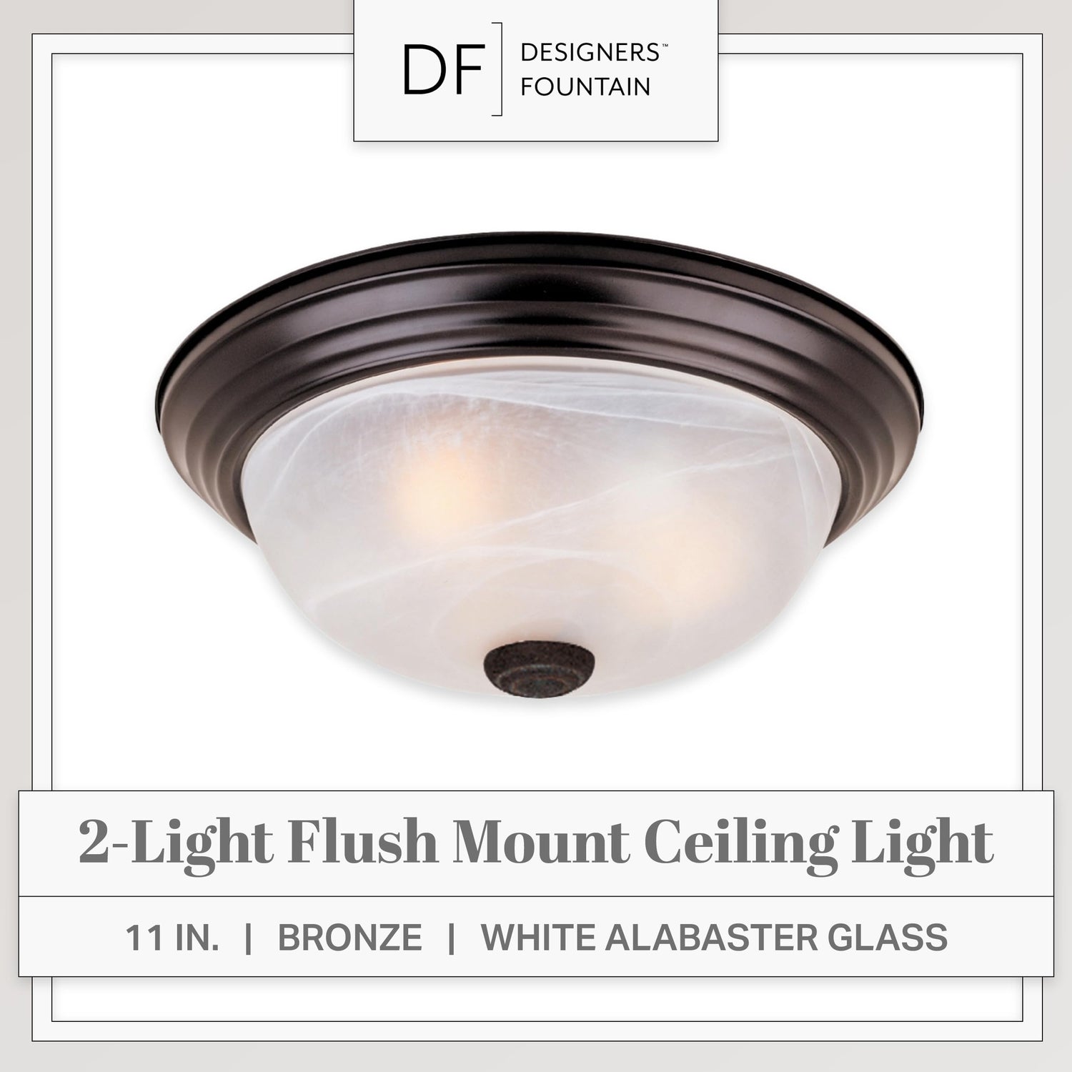 Details: Add bright interior illumination and a touch of elegance to your home with our DESIGNERS FOUNTAIN ceiling mounted light fixture. Constructed with durable long-lasting steel and sleek white alabaster glass, this ceiling mounted light fixture cover is great for adding a touch of class and sophistication to your home decor, and is perfect for use in bathrooms, bedrooms, stairwells, hall ways, utility rooms, or even the entrance to your home. This interior light fixture includes the necessary mounting hardware to allow for easy installation onto ceilings, and the flushed ceiling light also allows for easy bulb replacement. Our simple light fixture measures 11.25 W x 11.25 D x 4.5 H in inches, and is suitable for use with two 60W LED or incandescent bulbs (Bulbs not included). This round ceiling light is UL/cUL and damp location rated, and backed by a 1 year warranty. Enhance your home's lighting with this elegant and contemporary light fixture.