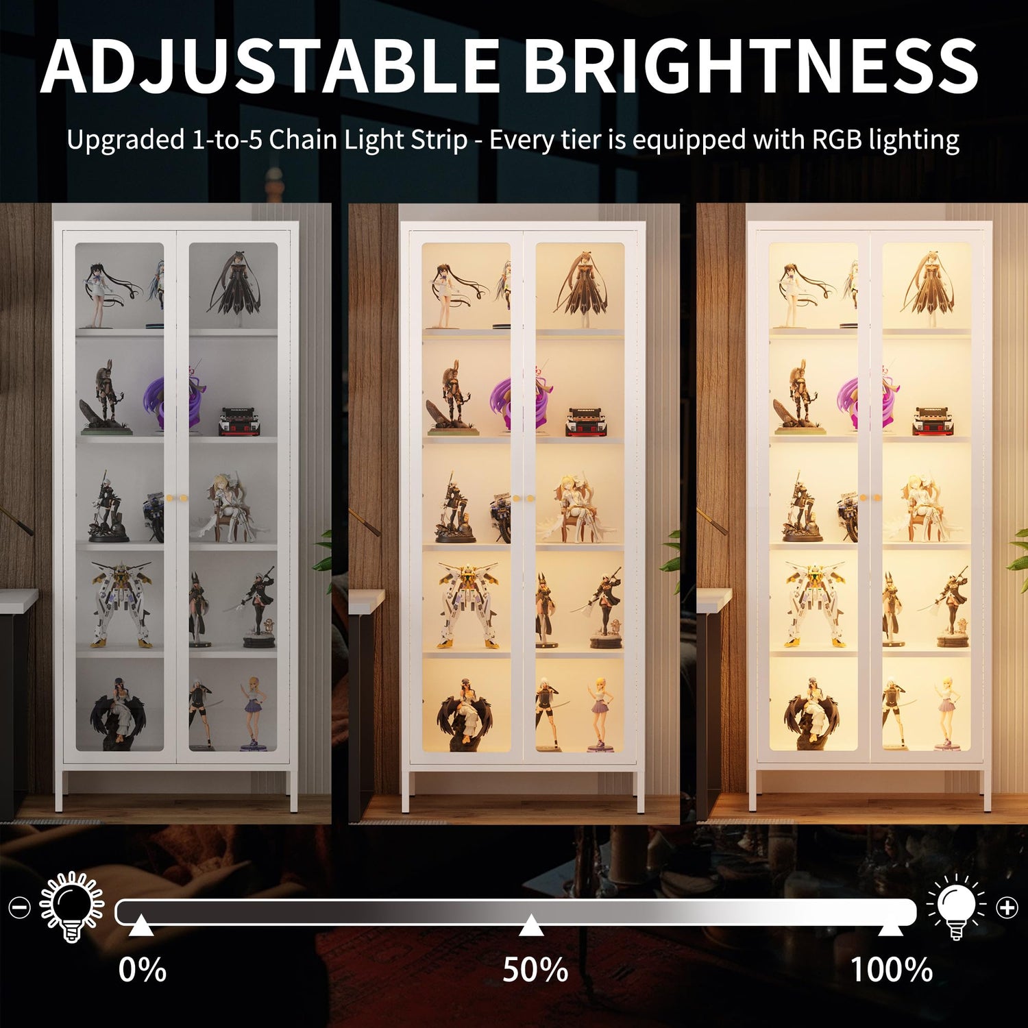 - 【UPGRADED! 13 Colors Magnetic RGB Lights & Dimmable Lighting】Even lighting throughout! The display cabinet with glass doors features our UPGRADED 1-to-5 magnetic RGB light system (one strip per shelf), delivering instant setup and full-coverage illumination that brightens every corner. Choose from 13 vibrant colors, controlled remotely to adjust hues, effects, and brightness. Showcase your treasures with museum-quality brilliance.