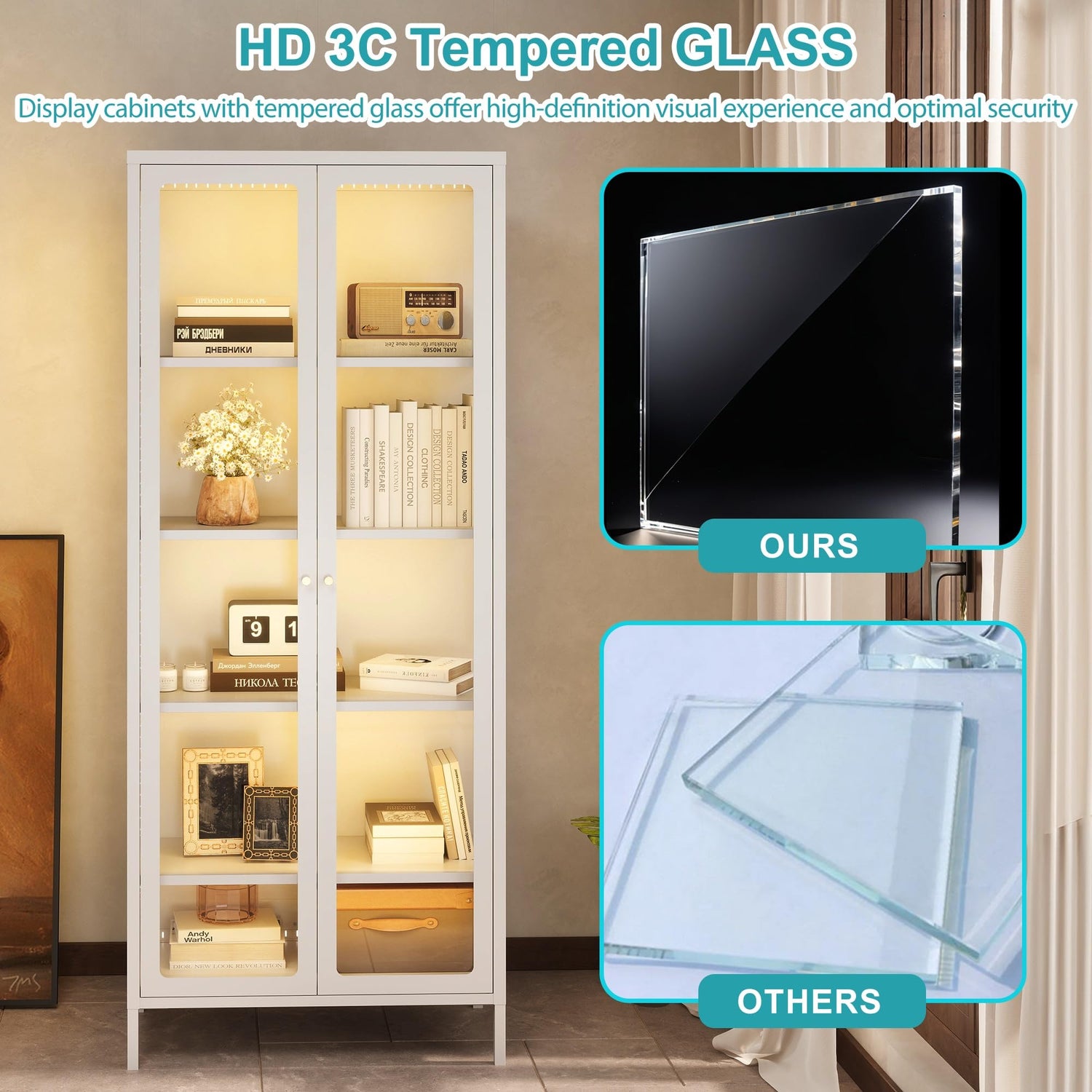 - 【Heavy Duty, Stable and Safe】The frame of the curio cabinets with glass doors are crafted with 0.5MM thick cold-rolled steel, which allows a 44 lbs load capacity for each shelf, perfect for heavy collectibles. The anti-tilt design and anti-explosion 3C-certified tempered glass further reinforces the cabinet's stability and durability, guaranteeing a secure and safe display environment for your valuable items.