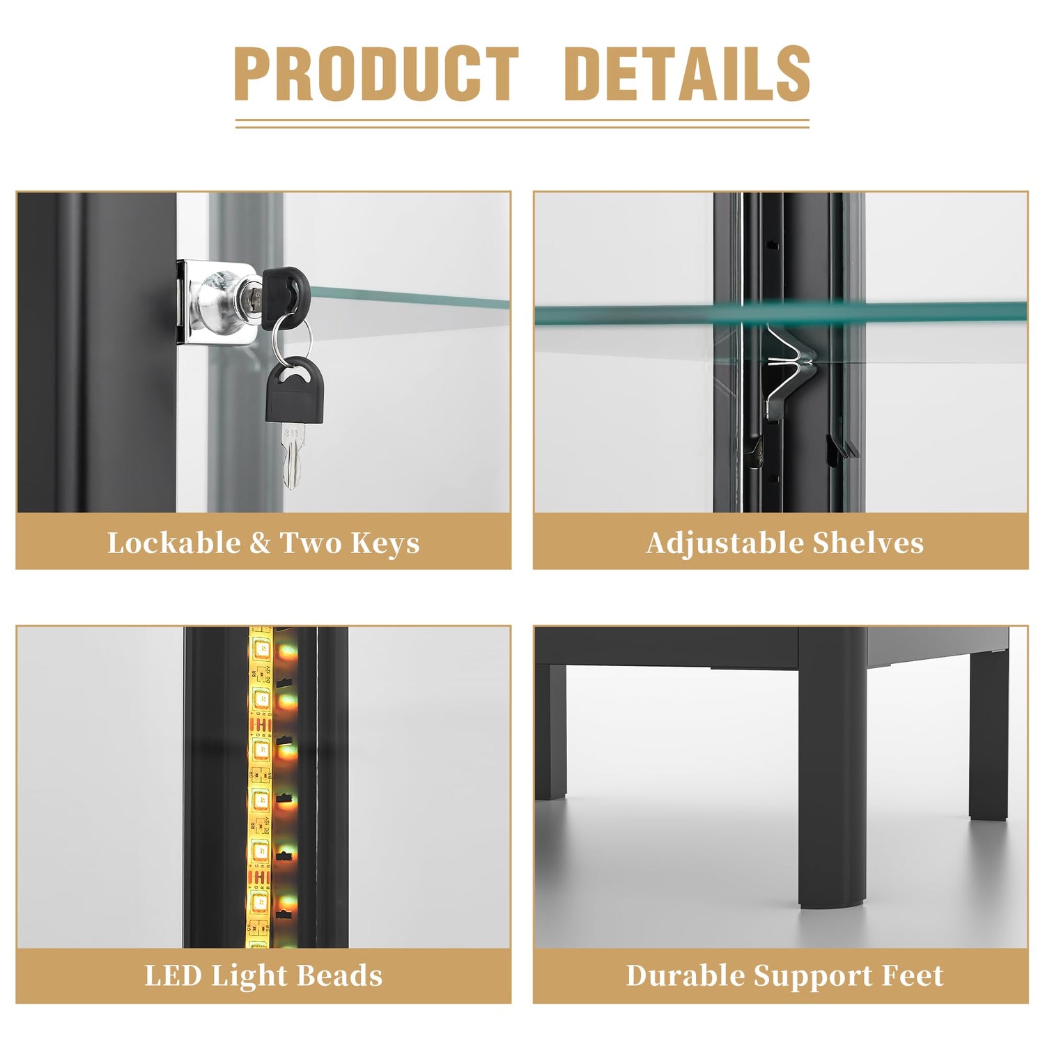 - 【13 Customizable RGB Colors & Dimmable Brightness】Set the perfect mood for any occasion—whether it's a party, retail display, or personal showcase. With 13 vibrant RGB colors and adjustable brightness, our glass display cabinet with lights highlights your collectibles in stunning detail, even in low light. High-quality LED strips ensure brilliant illumination, making every piece stand out.