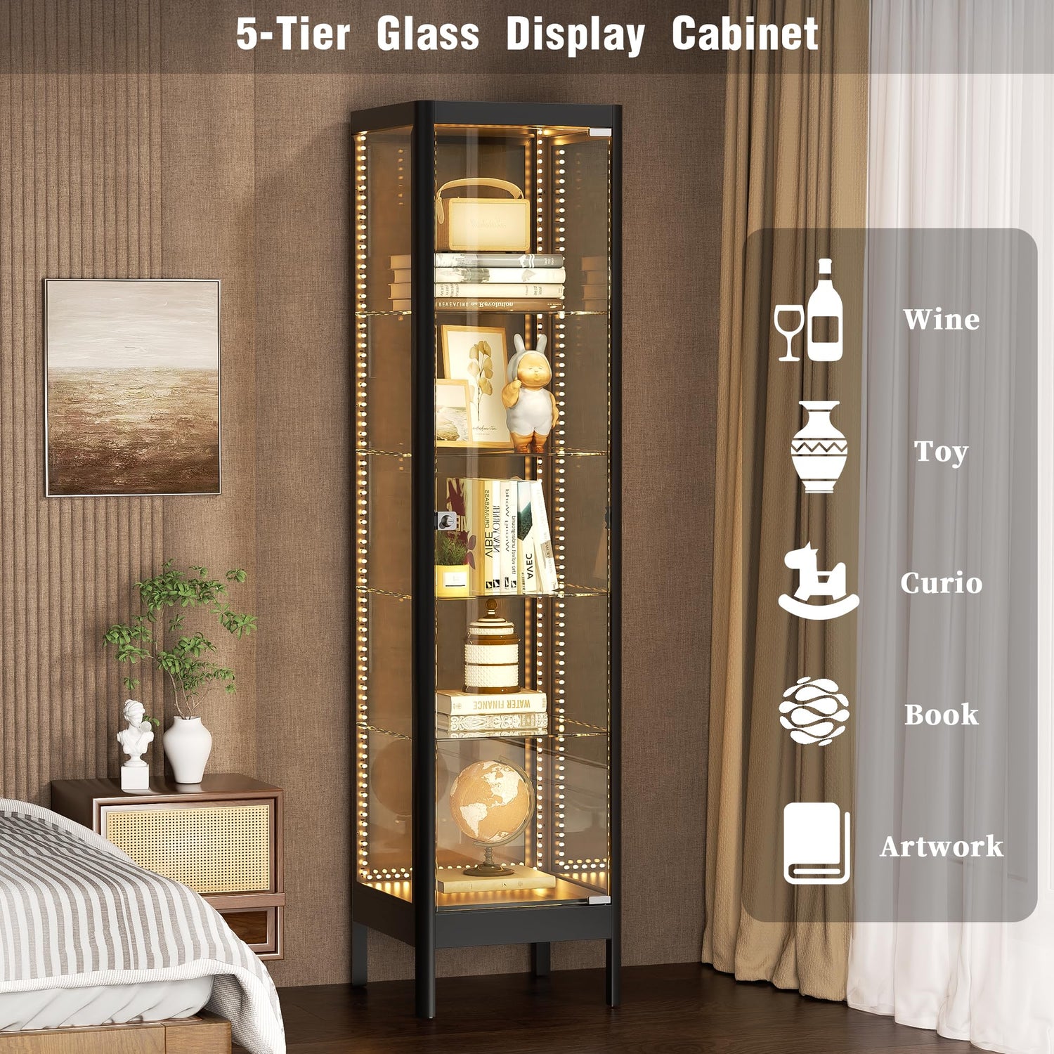 - 【Spacious & Adjustable 5-Tier Shelving】 With 4 adjustable glass shelves inside a 15.8” L x 15.4” W x 63” H frame, this glass cabinet display case offers flexible storage for collectibles of all sizes. Easily customize the layout to fit figures, trophies, memorabilia, curios, models and more.