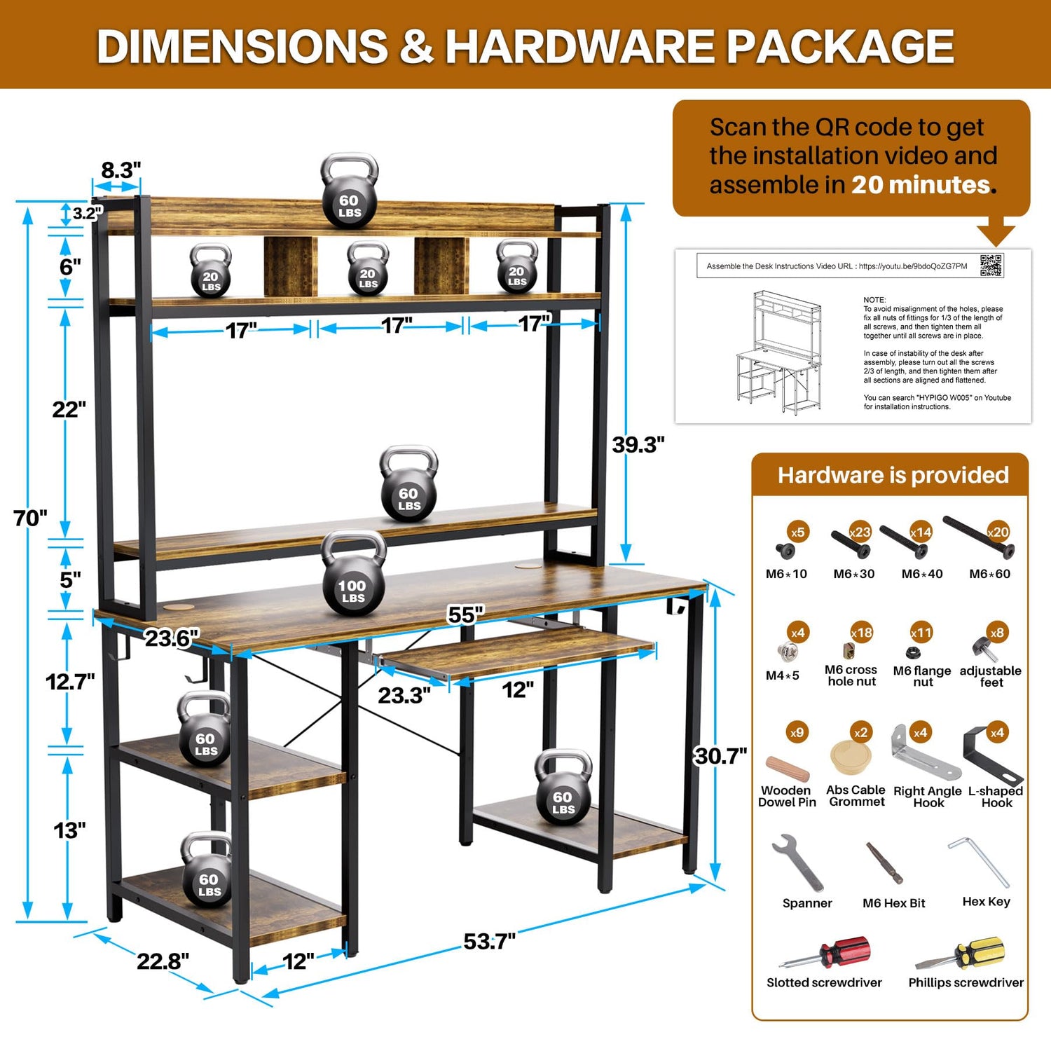Transform your workspace with the HYPIGO Rustic Brown Heavy Duty Computer Desk with Hutch and Keyboard Tray. This modern desk combines functionality and style, making it an ideal choice for work, gaming, or studying. Its sophisticated rustic brown finish not only enhances the aesthetic of your room but also helps create a tidy and productive environment.