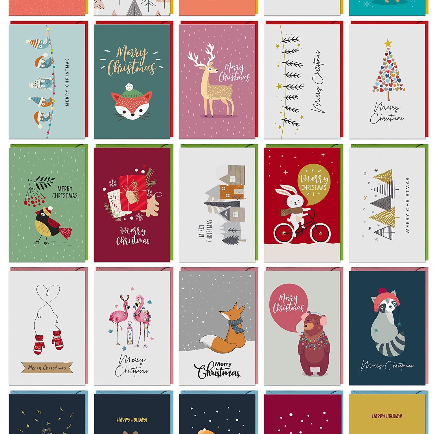 Dessie 100 Unique Modern Christmas Cards with Envelopes and Matching Sealing Stickers. Happy Holiday Cards with Short Greetings Inside. Bulk Christmas Cards Boxed with Envelopes