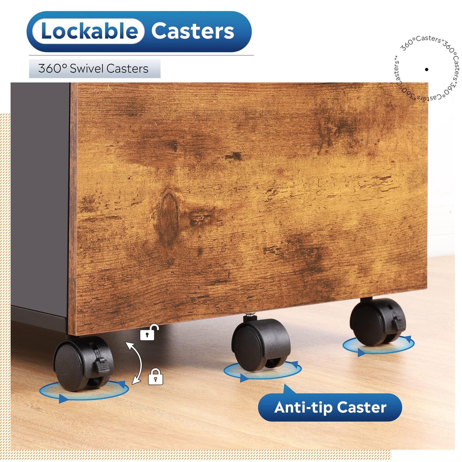- Easy to Move: The rolling file cabinet has 5 wheels, it can fix or move around your home office freely. Built-in brakes on front 2 casters to keep the filing cabinet in position and add stability. The bottom drawer with a caster under it that can prevent tipping.