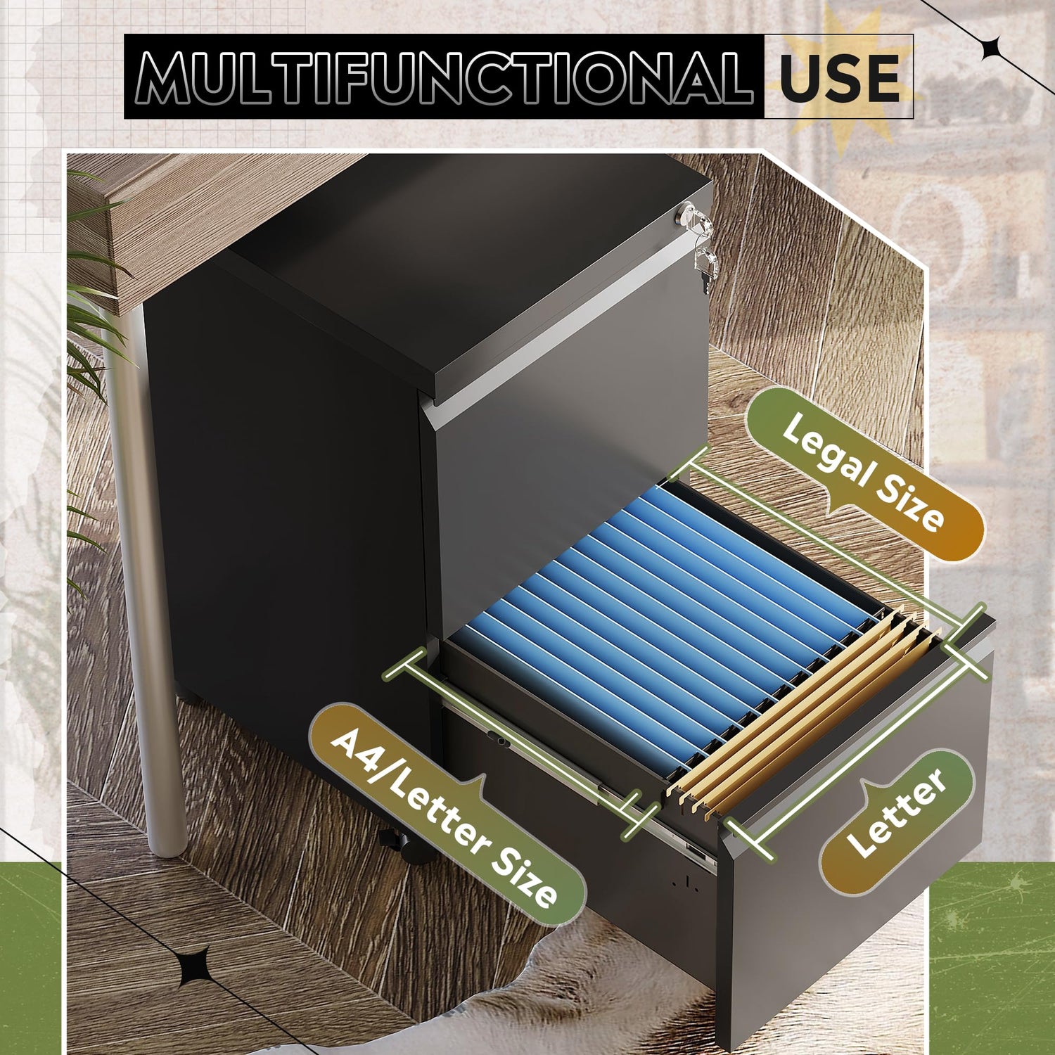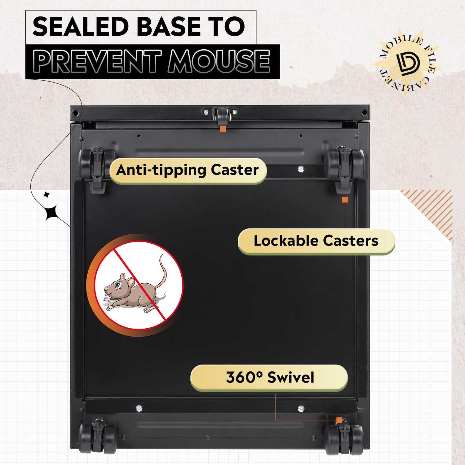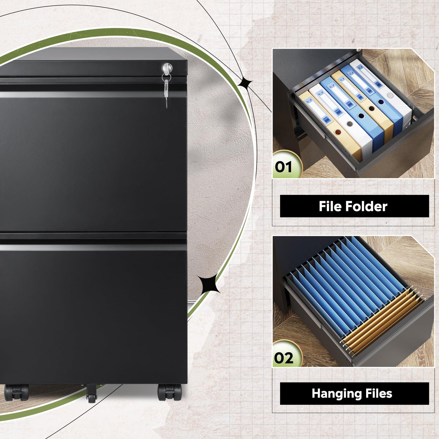 - EASY TO MOVE: Rolling file cabinet design with 2 front casters with braking function and 1 center caster to prevent tipping.