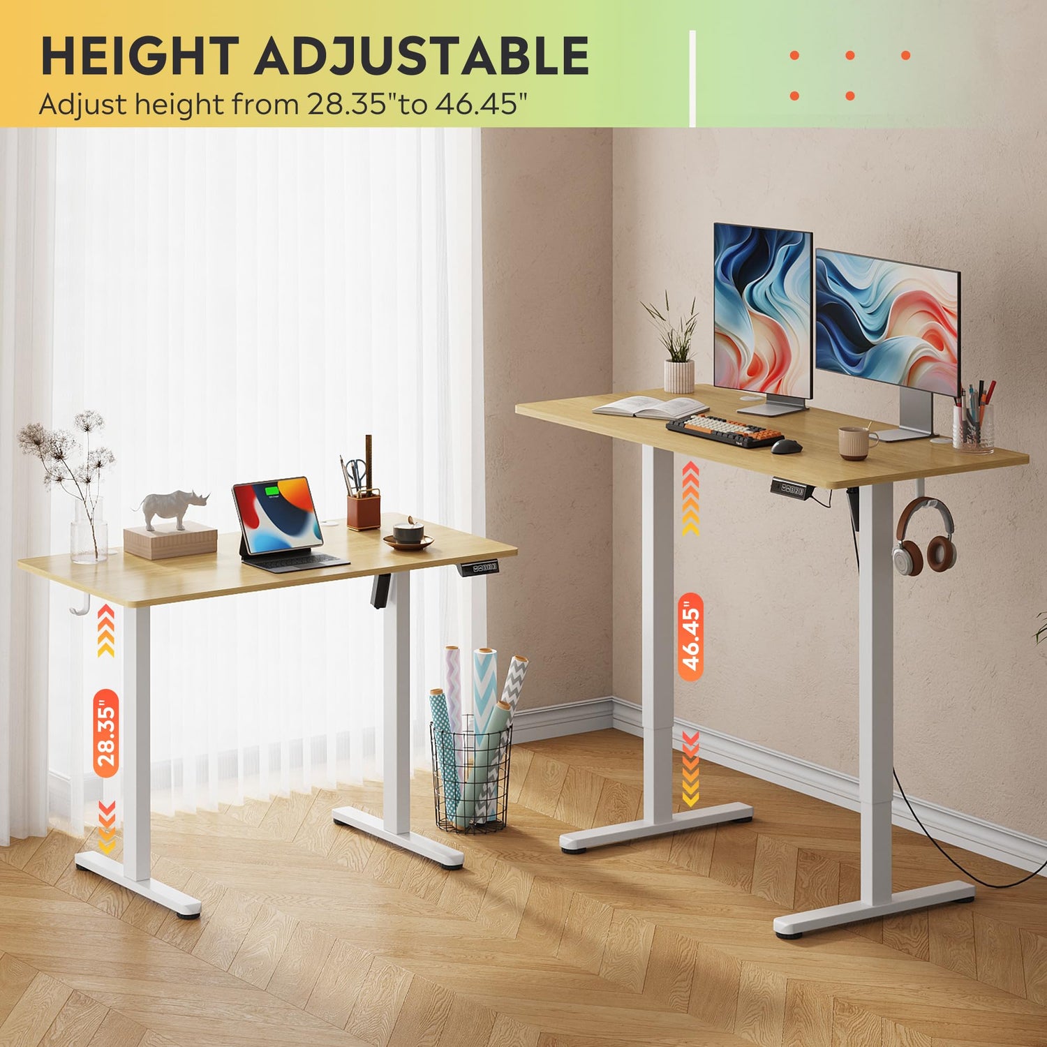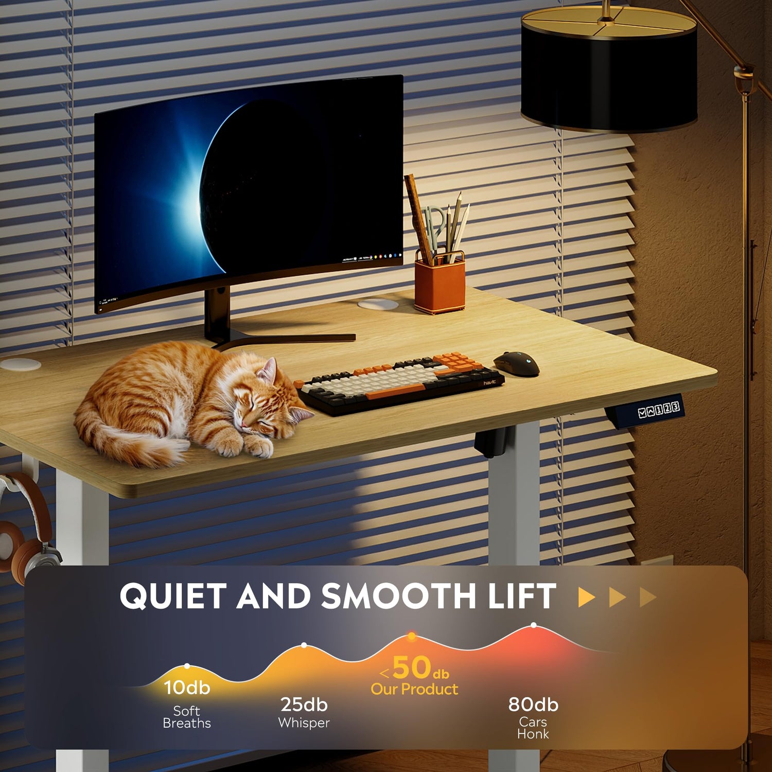 - Customized Sit Stand Desk : The reliable motor operates quietly (under 45 dB)and smoothly, all your things stay steady&secure in motion. The intuitive control panel allows you to preset 3 preferred heights, switch between sitting and standing positions has never been easier. Child lock for total peace of mind.