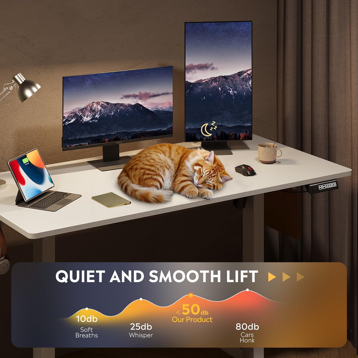 - Customized Sit Stand Desk : The reliable motor operates quietly (under 45 dB)and smoothly, all your things stay steady&secure in motion. The intuitive control panel allows you to preset 3 preferred heights, switch between sitting and standing positions has never been easier. Child lock for total peace of mind.