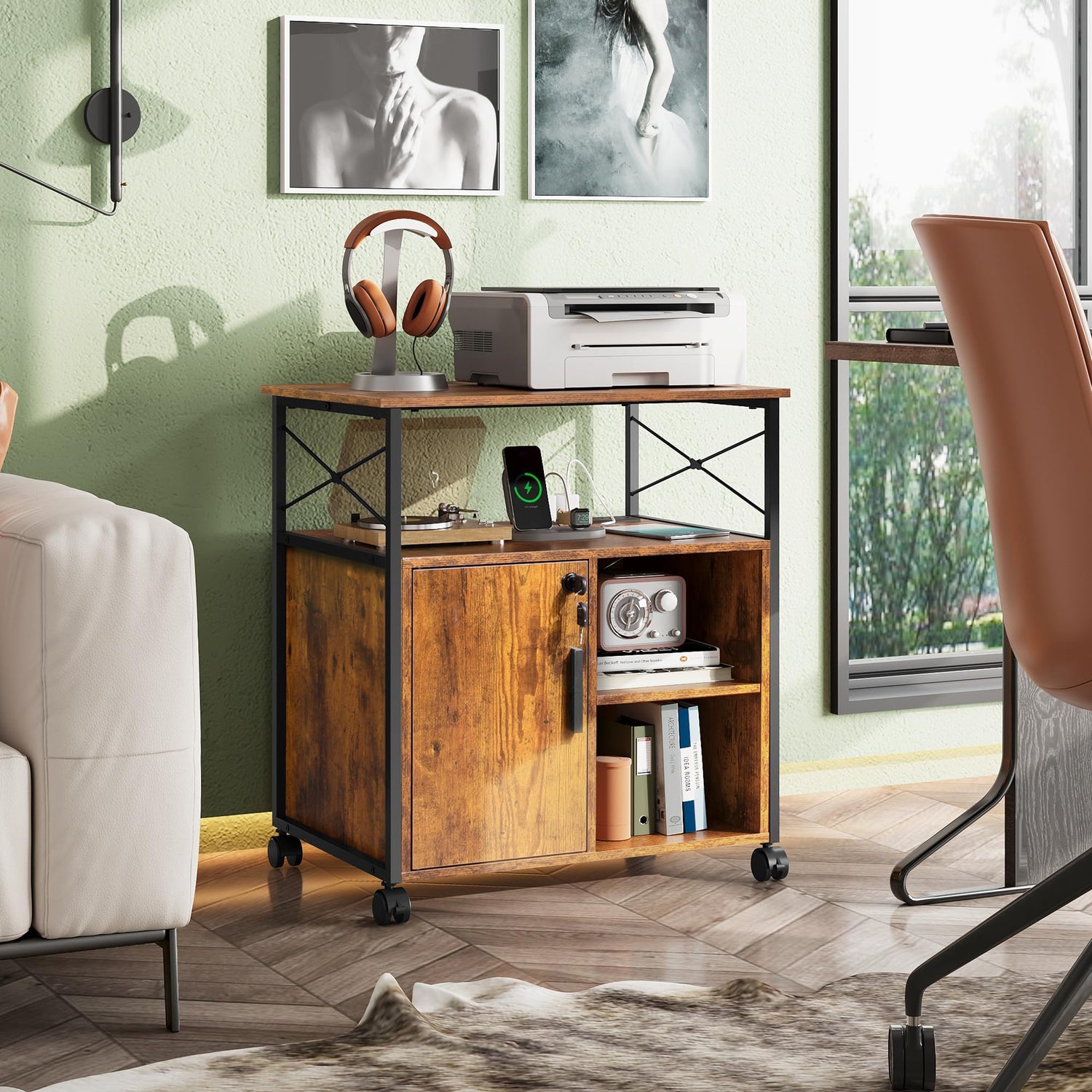 - Multi-functional and Lockable: This mobile printer stand offers multiple storage options, including a cabinet with a door and two open shelves. The open storage space is suitable for storing folders, books, and decorative items, and the height of the shelves can be adjusted according to different storage needs. Additionally, the cabinet door can be locked to ensure the security of files and personal items.