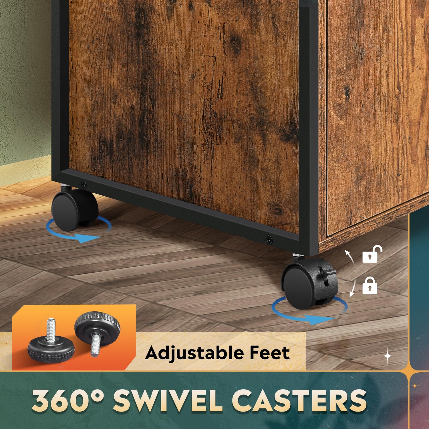 - Easy to Move: Equipped with 4 swivel casters, the filing cabinet can be freely moved around. The front 2 casters have built-in brakes, allowing you to place the cabinet under or next to your desk with ease. The casters can be replaced with adjustable feet to increase stability.