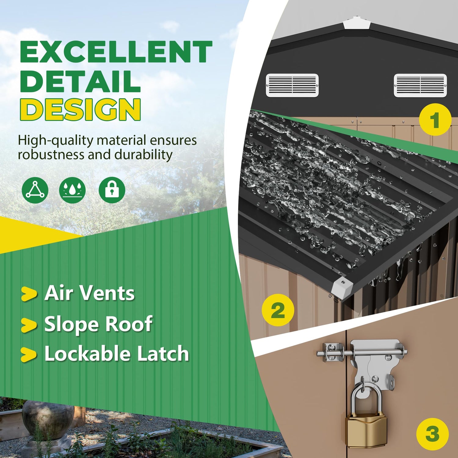 - [ Safety and Durability ]: Metal shed's pitched roof effectively prevents rainwater accumulation, while the equipped door lock ensures security. What's more, the equipped ventilation openings also allow for better air circulation.