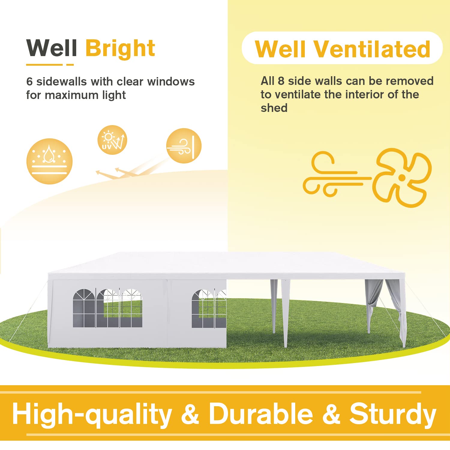 - [ Easy Assembly ]: The outdoor party tent is designed for easy installation without the need for complicated screw fixing or additional tools, allowing you to set it up quickly.