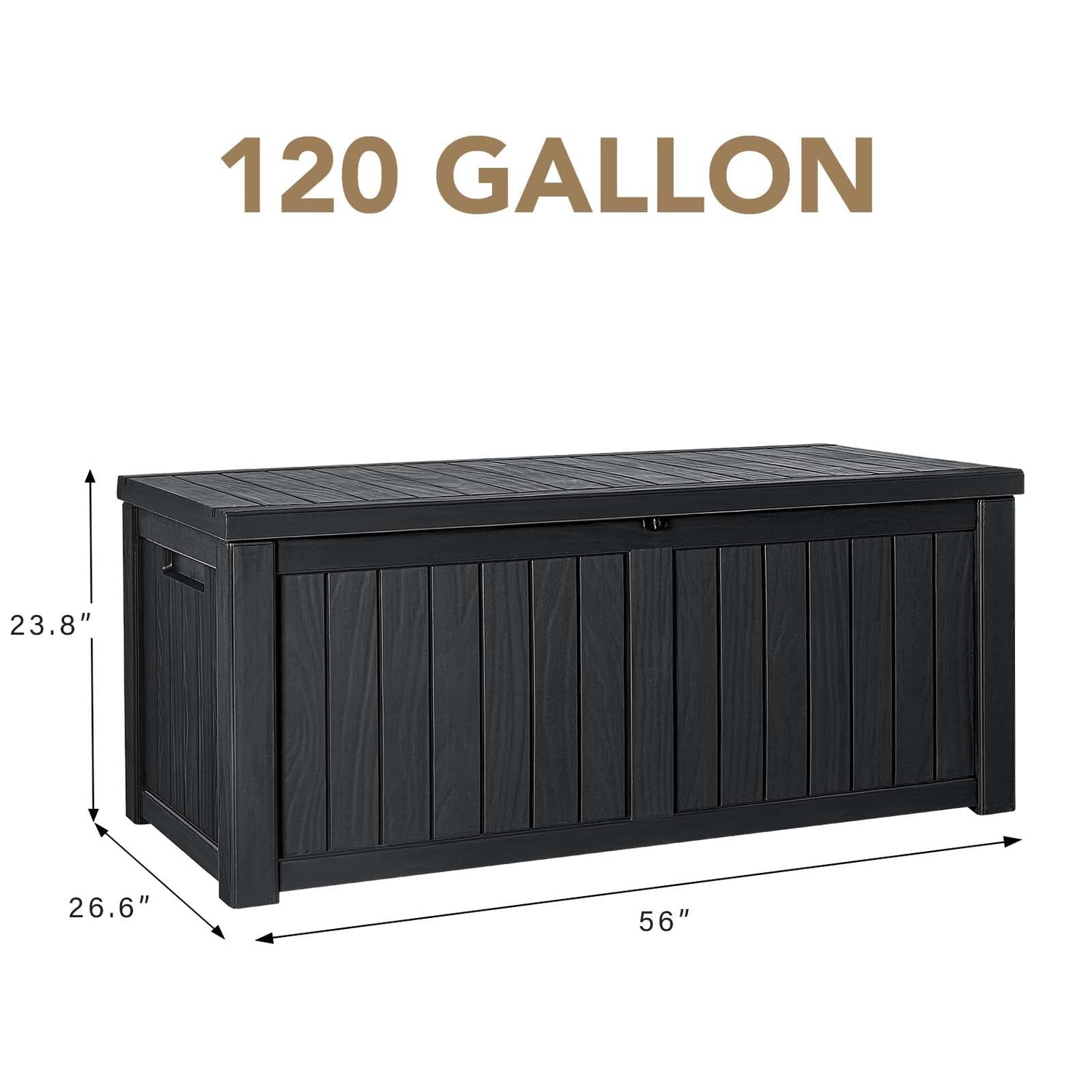 - Large Capacity : The resin deck box is 56 "x 26.6" x 23.8 "with 120 gallons of mass storage. Ample storage for indoor and outdoor items such as sporting goods, children's toys, seat cushions and pillows. It is enough to meet your daily needs.