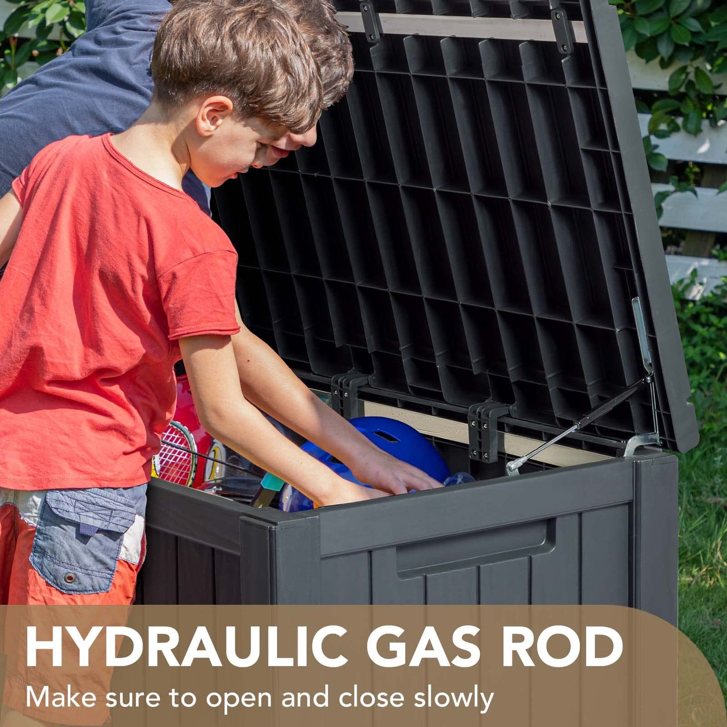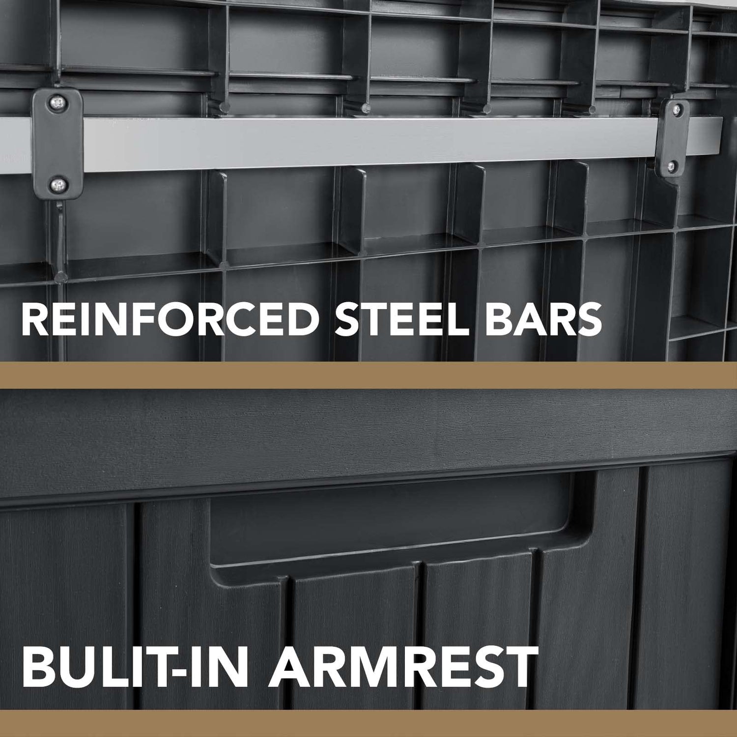 - Steel Bars x 3 : The maximum load in the box is 110 LBS. The deck box has three steel bars for reinforcement to further strengthen the structure and strength of the box. The reticulated structure makes the case resistant to deformation and ensures the load-bearing capacity inside the case.