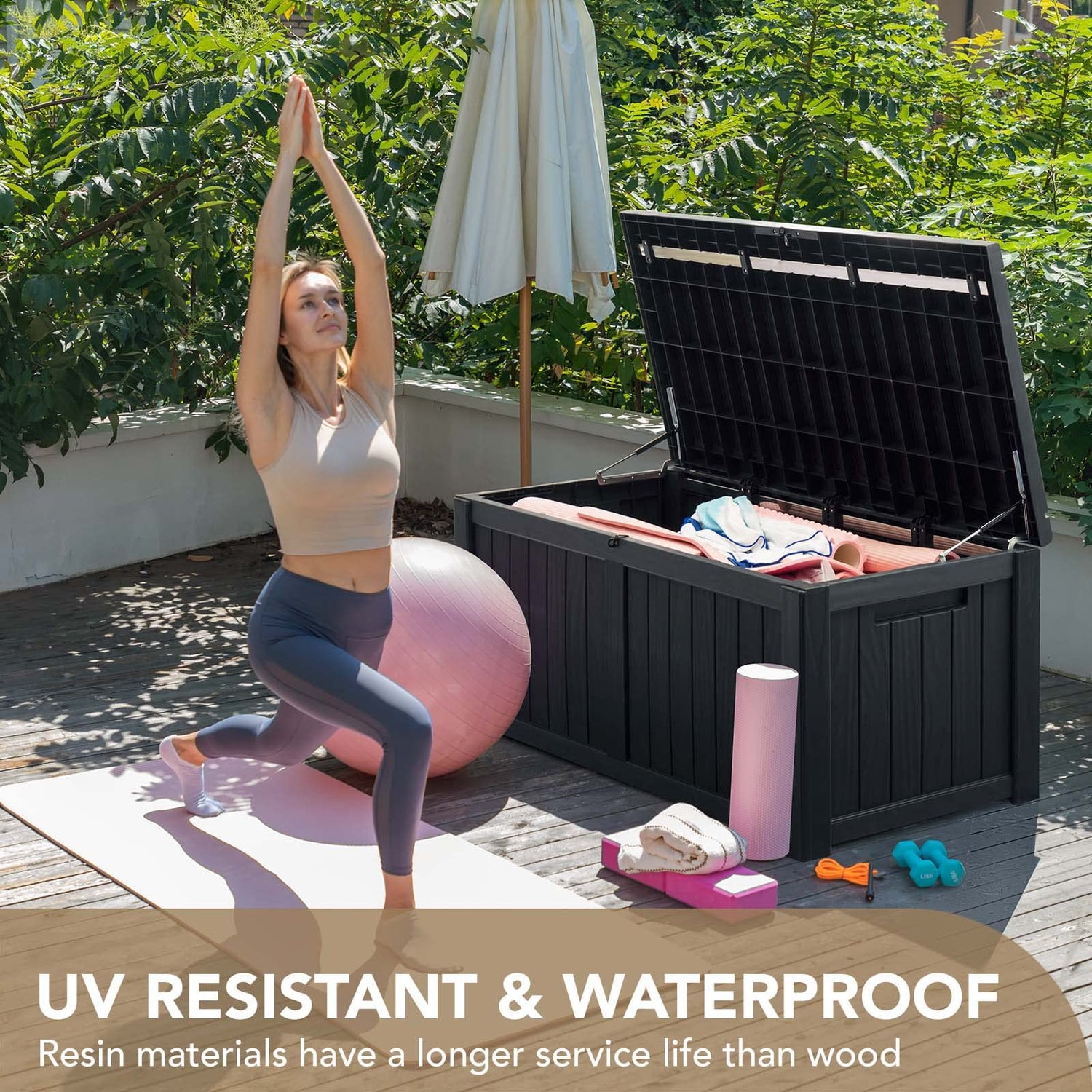 - Resin Material : The main body of deck storage box is made of resin material, which has a longer service life, and better UV protection and waterproof performance than wood or rattan. It can be placed anywhere you want, such as on the deck, by the sink, on the porch, in the garden.