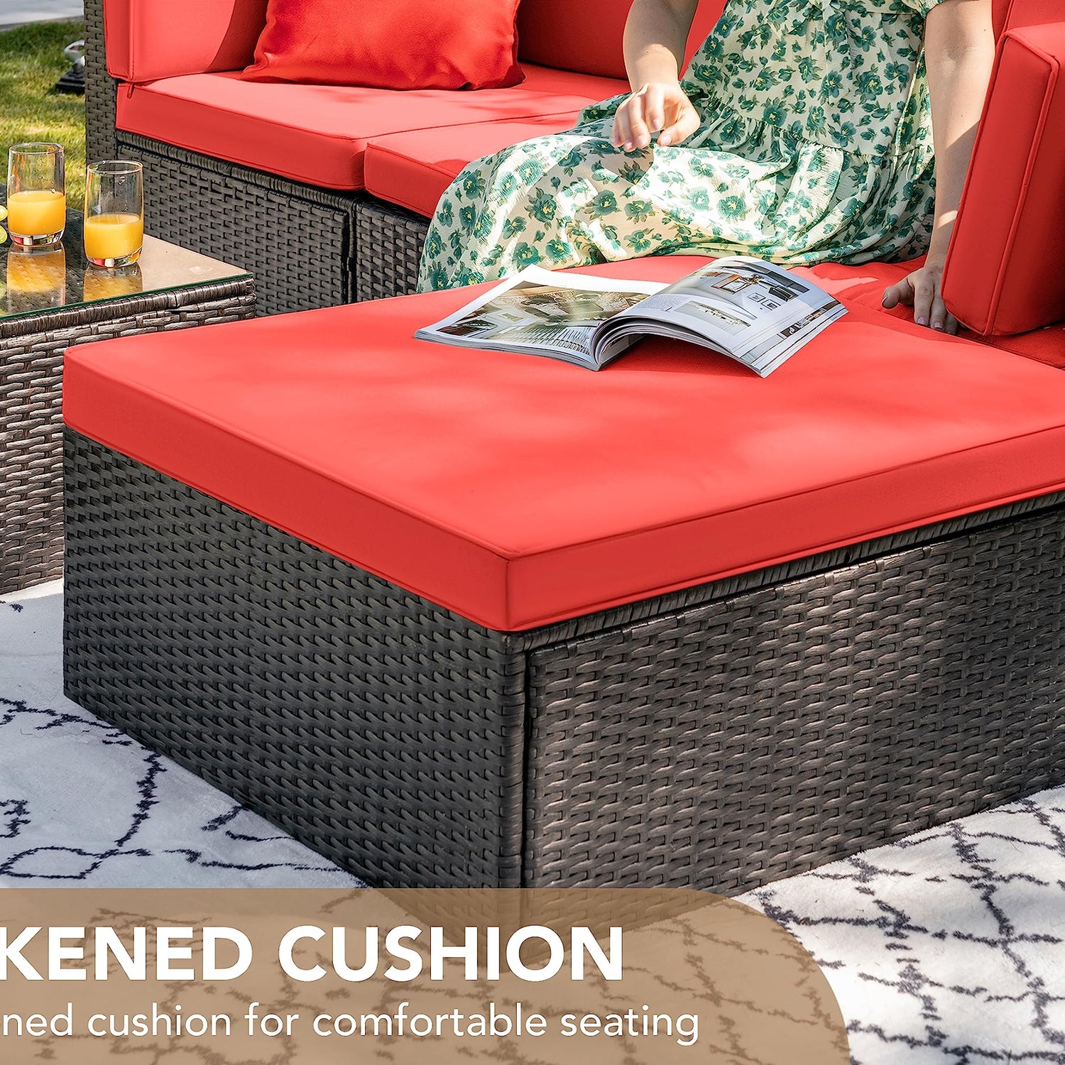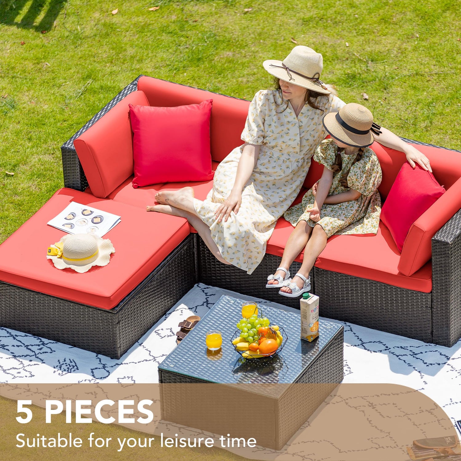 Devoko 5 Pieces Patio Furniture Sets All Weathevr Outdoor Sectional Patio Sofa Manual Weaving Wicker Rattan Patio Seating Sofas with Cushion and Glass Table (Red)