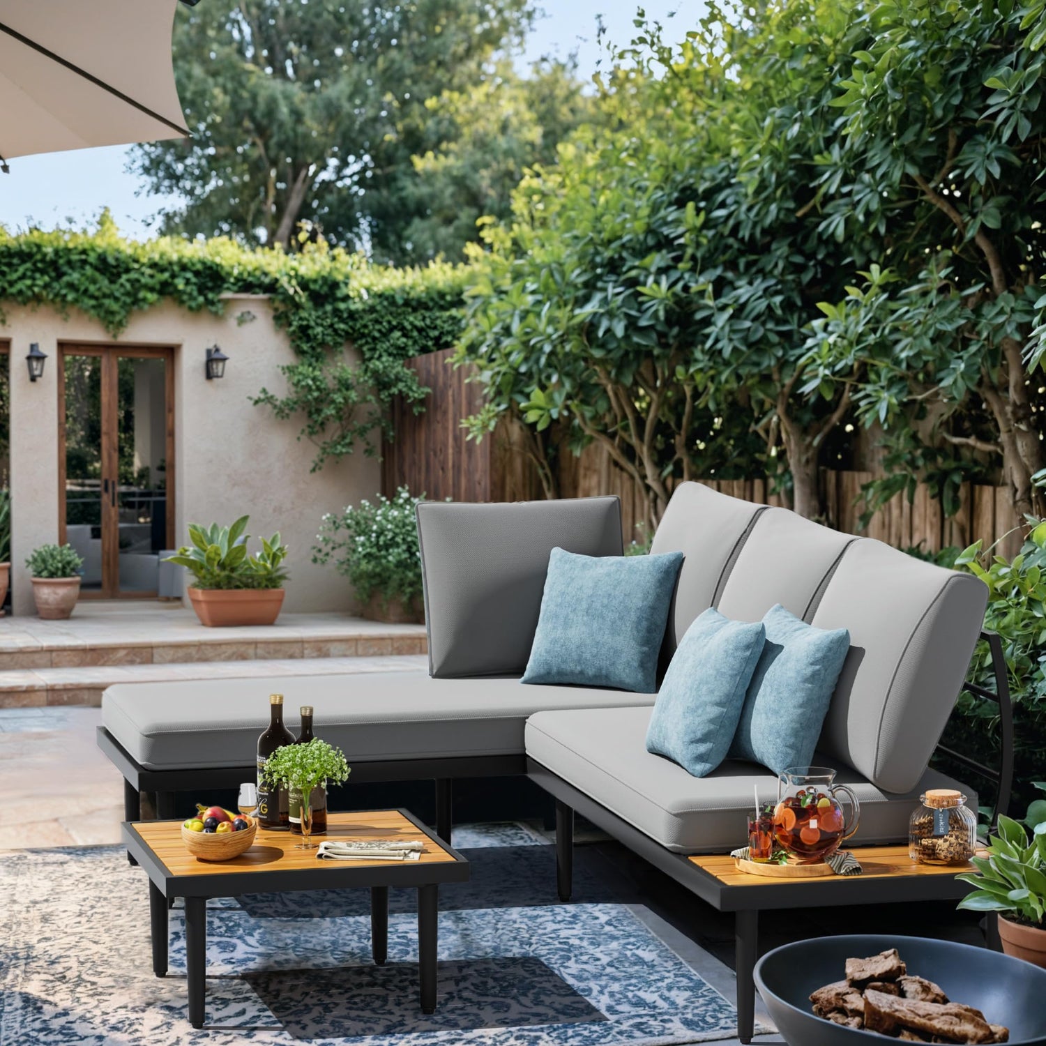 Devoko Outdoor Sectional Furniture Patio Sectional Sofa with Acacia Wood Table, Patio L-Shaped Conversation Set with All-Weather Cushion for Patio,Garden,Backyard(Gray)
