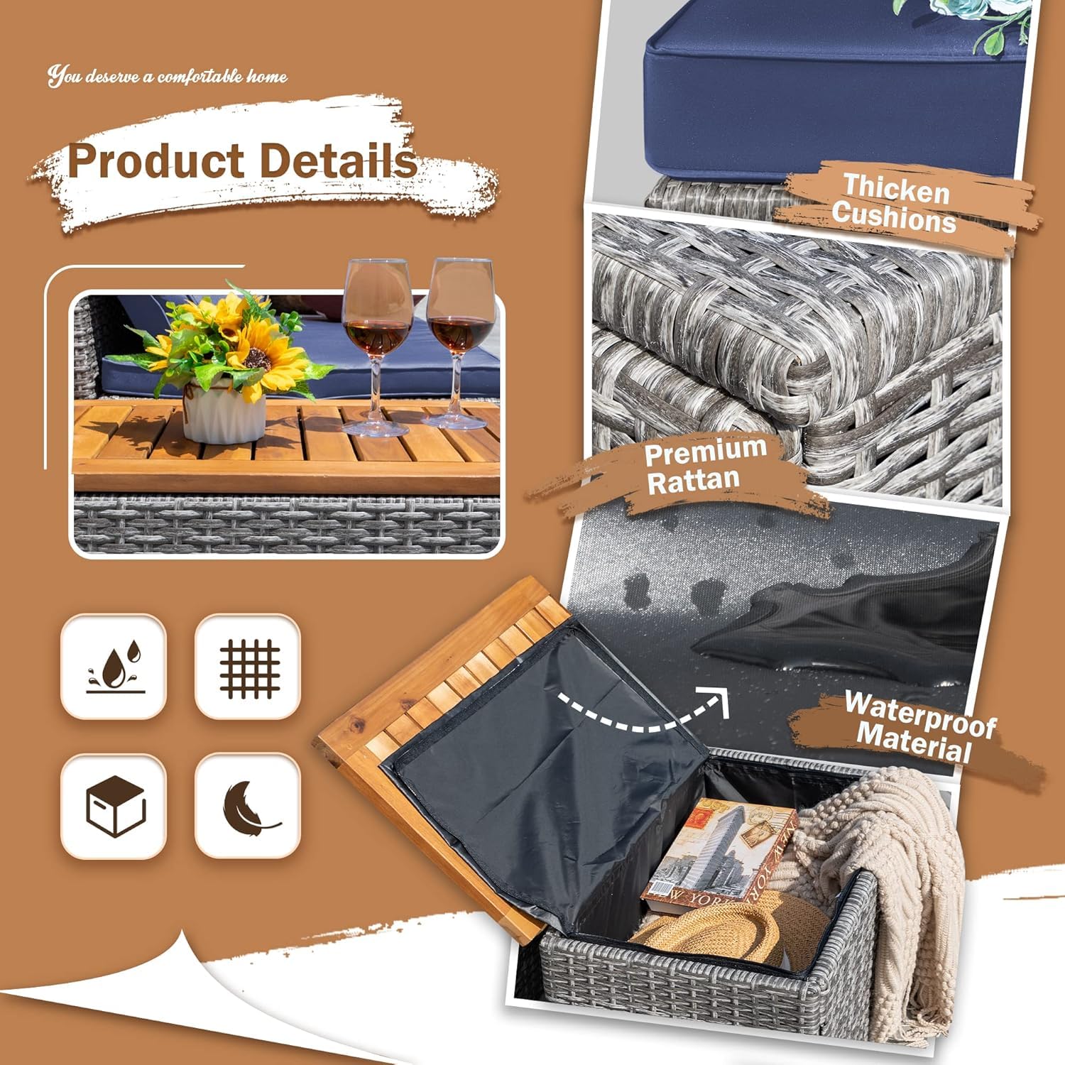 - Space-saving Design:When you are worried that the activity area is too small, the footstool of rattan daybed can be pushed under the sofa, and the footstool and two small tables can be used as storage boxes,a lot of things can be stored in it ,saving a lot of storage space