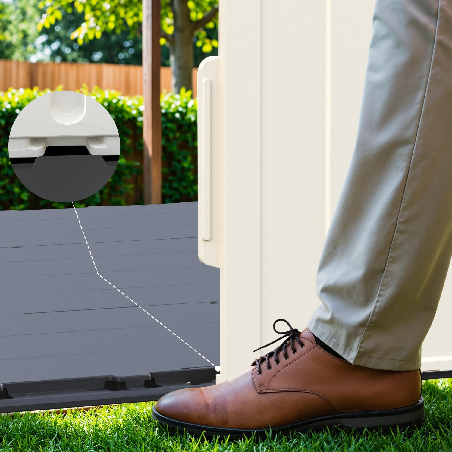 - KICK-IT Installation: Approximately 35% fewer screws are required, the wall of resin shed connected to the floor only needs to be aligned and installed by kicking with feet to complete the installation. Before installation, make sure the ground is level.