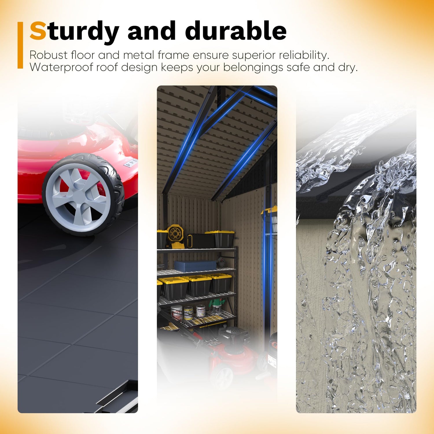 - Large Storage Capacity Space: This resin storage shed with floor is stylish and weather resistant. Large inside provides ample space to hold your mower, ladders, bikes, garden tools, and other lawn care equipment.