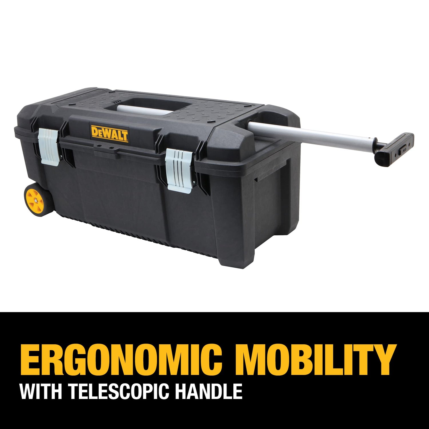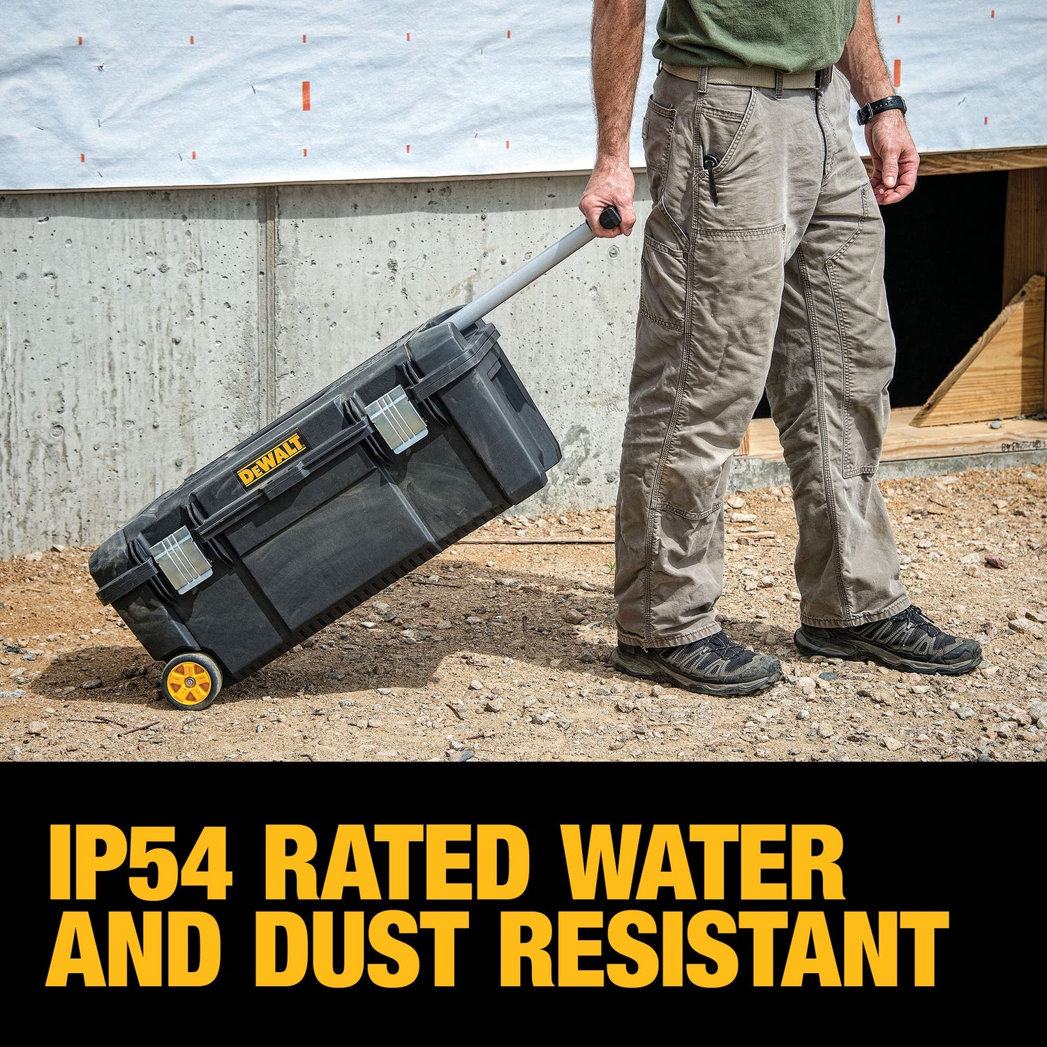 Details: Staying true to its Gauranteed Tough(R) philosophy, DEWALT is offering it's wheeled toolbox. The 28" toolbox has wheels, a telescopic handle as well as a carrying handle and offers a large storage compartment ideal for carrying medium-to-large items and includes a portable inner tray for smaller itesm. It has an IP54 water and dust resistance rating and anti-rust metal latches to protect it from the elements.