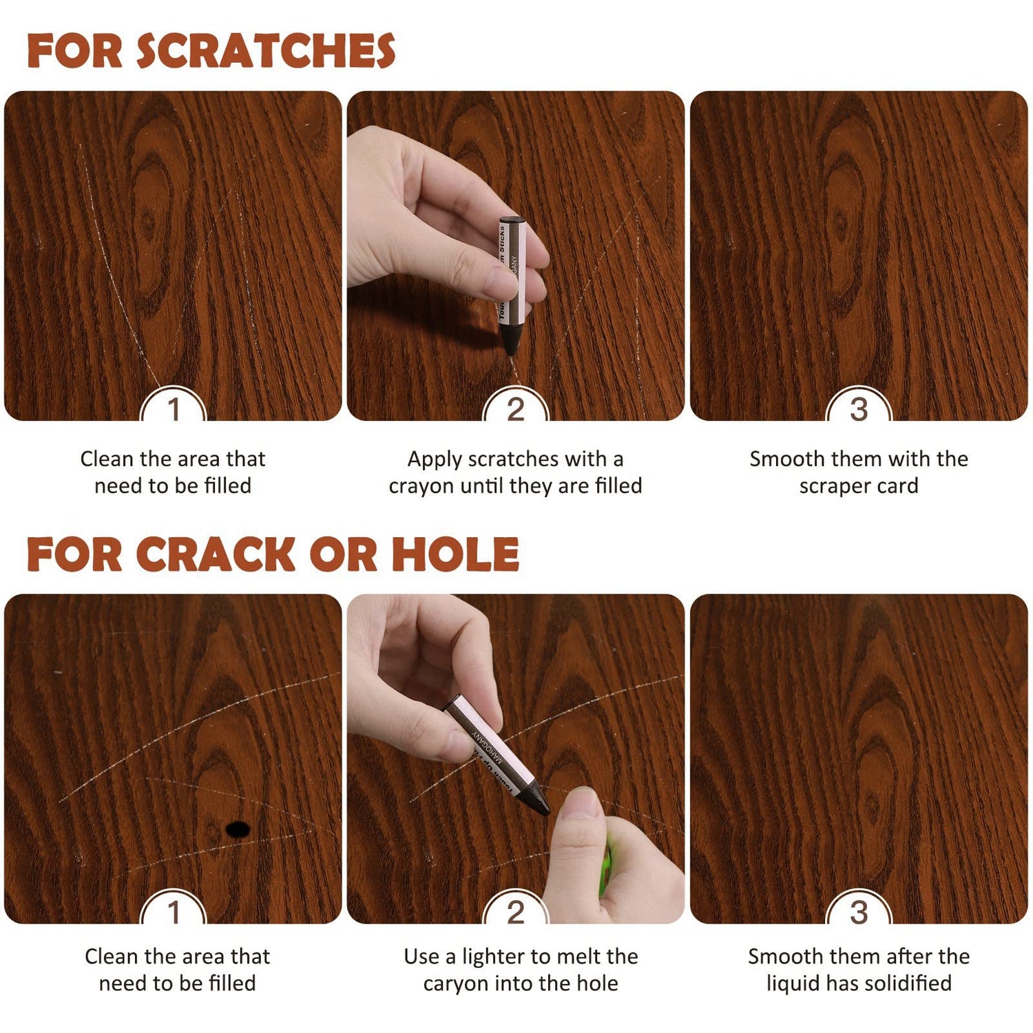 - [Easy-to-Use] To repair a piece of furniture, select or blend the color that matches your furniture. After applying the filler to any cracks or scratches, smooth the surface using a scraper. You can use the markers to draw wood grain or to patch up any minor scratches.