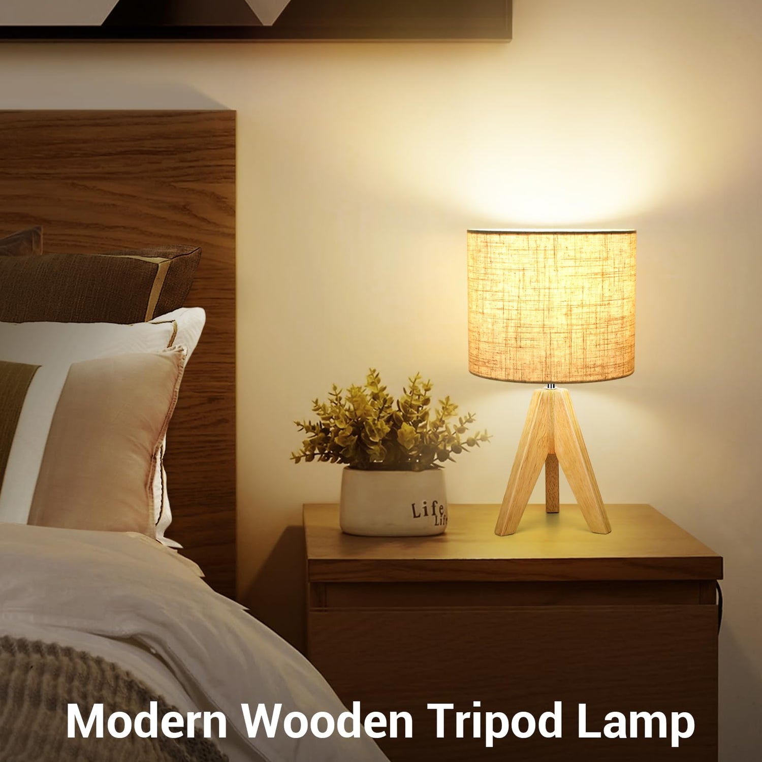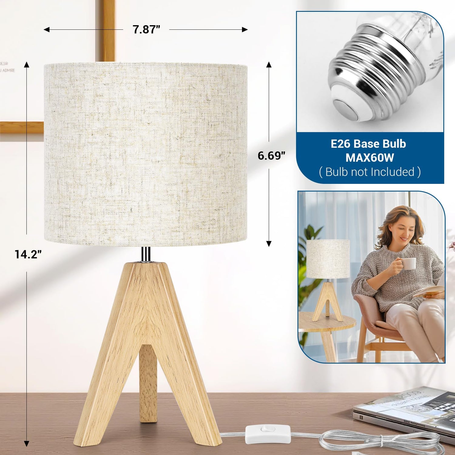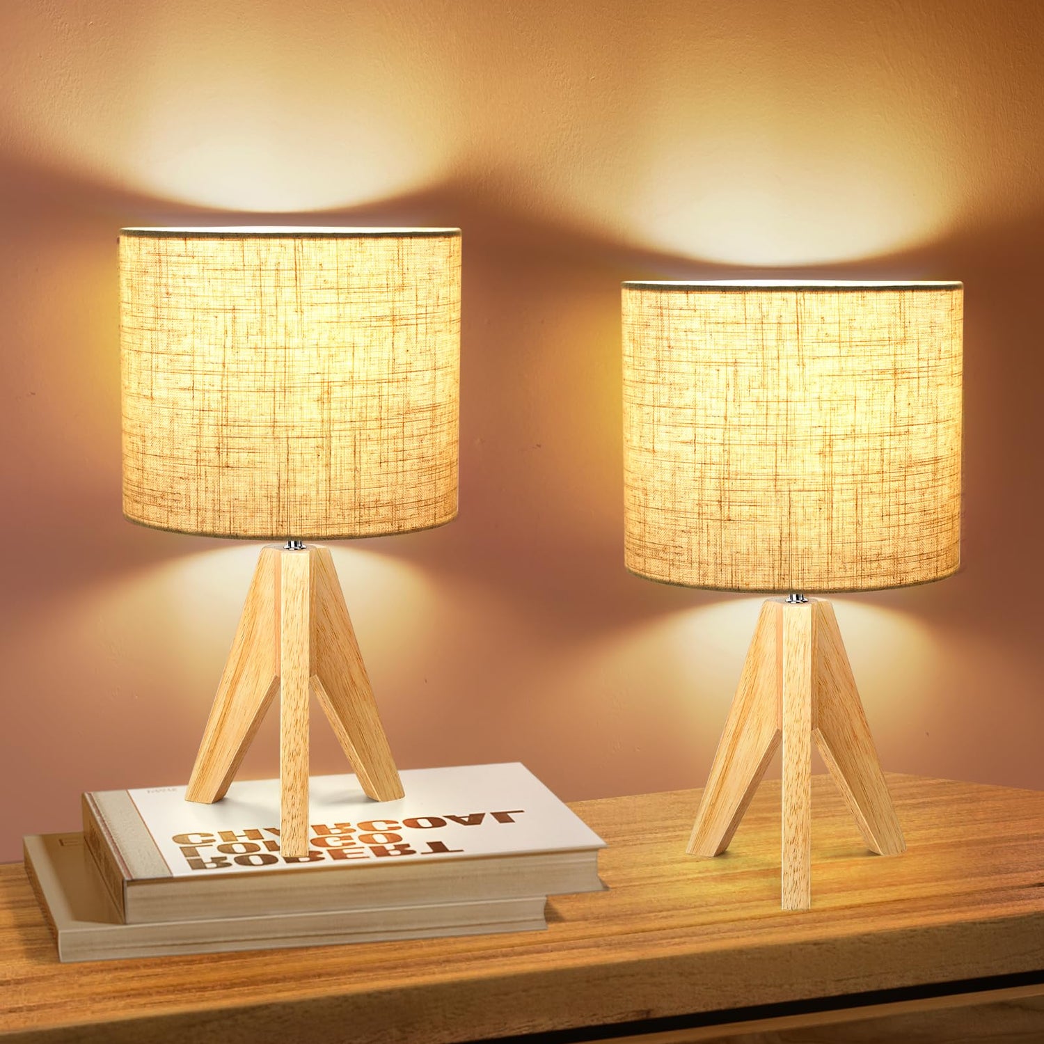 DEWENWILS Mid Century Table Lamps, Small Wooden Tripod Bedside Lamps with Linen Fabric Shade, Nightstand Lamp for Nursery, Bedroom, Kids Room, Side Table, Reading Desk, 14.2 Inch, 2 Pack