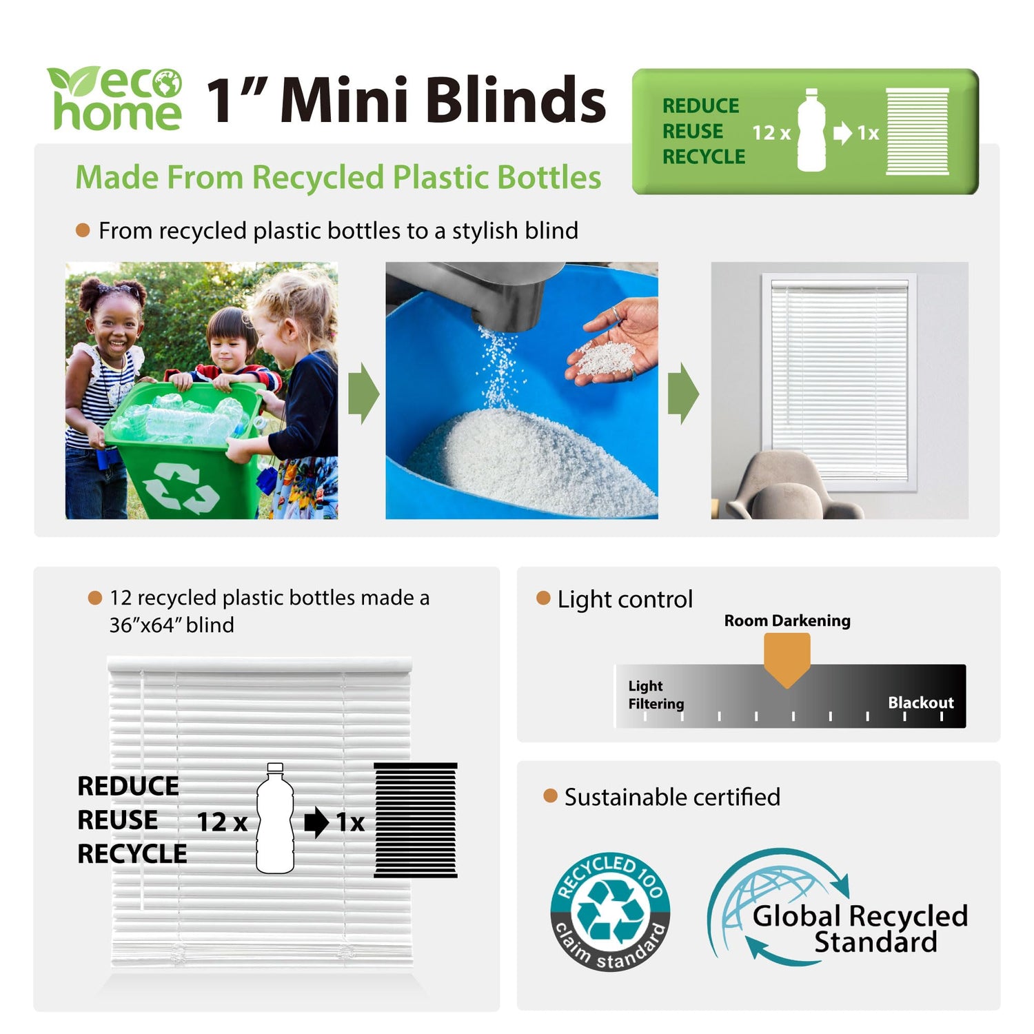 - Innovative Sustainability: Crafted from recycled materials, our blinds boast pearl-like luster finish. With durability & resistance to warping, fading, and sagging, perfect for humidity areas.The robust, flexible slats quickly recover their shape.