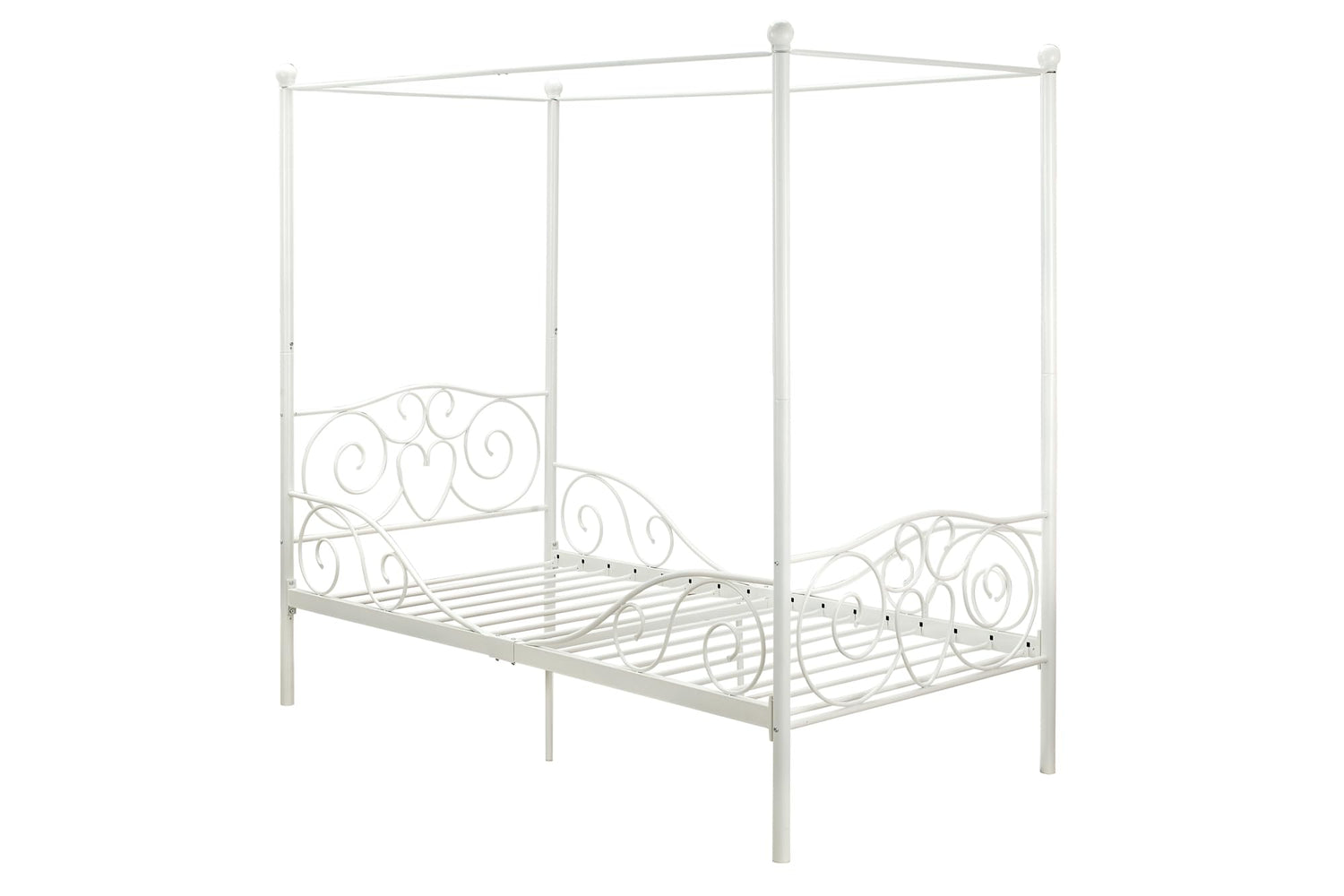 Details: Make bedtime more enticing with the DHP Canopy Metal Bed. The embellished heart scroll design on both the headboard and footboard evokes an elegant yet fun look for your princess’s room. This twin canopy bed frame fits a twin bed for kids and features four canopy posts, topped with gracious finials. Highlight its beauty even more by placing sheer curtains over the posts. The layered effect creates a special place for your little girl to play and sleep. Designed to fit a standard mattress, this bed frame for twin beds includes metal slats that eliminate the need for a box spring. Suitable for those looking for twin bed frames for kids and twin bed frames with storage, it combines practicality and style.