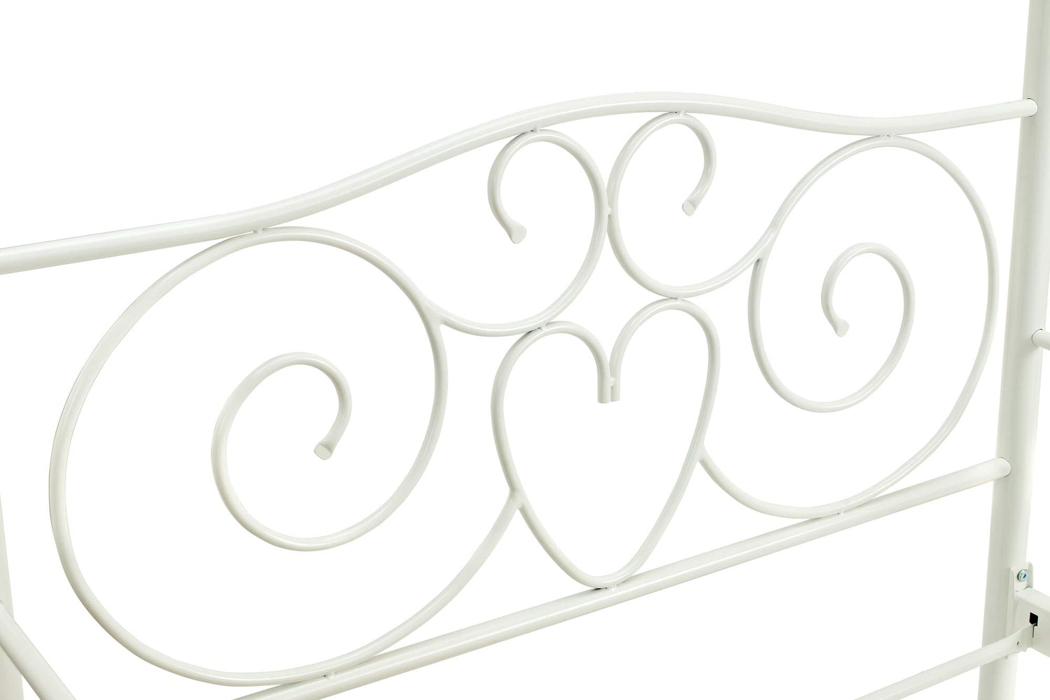 - Sturdy metal frame with a heart scroll design and round finial posts.