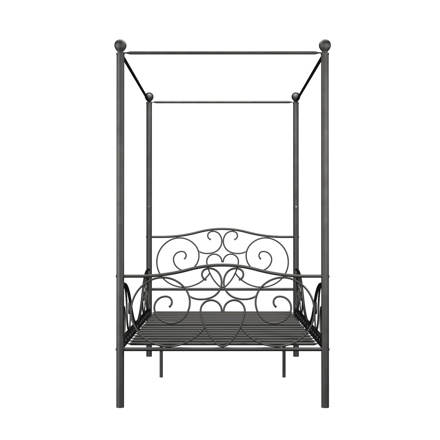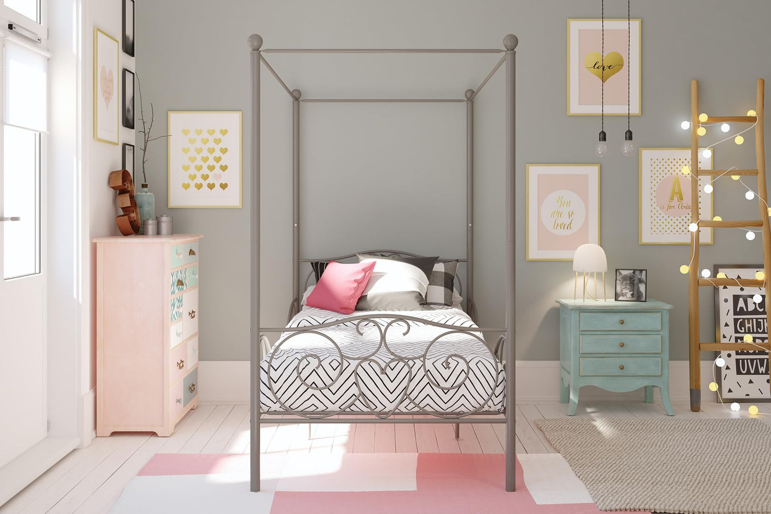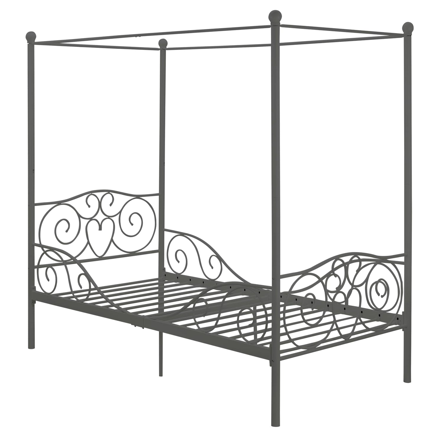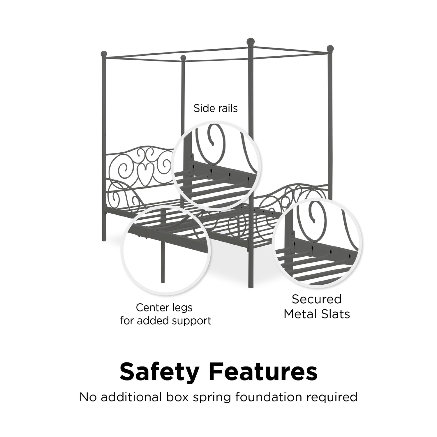 Details: Make bedtime more enticing with the DHP Canopy Metal Bed. The embellished heart scroll design on both the headboard and footboard evokes an elegant yet fun look for your princess’s room. This twin canopy bed frame fits a twin bed for kids and features four canopy posts, topped with gracious finials. Highlight its beauty even more by placing sheer curtains over the posts. The layered effect creates a special place for your little girl to play and sleep. Designed to fit a standard mattress, this bed frame for twin beds includes metal slats that eliminate the need for a box spring. Suitable for those looking for twin bed frames for kids and twin bed frames with storage, it combines practicality and style.