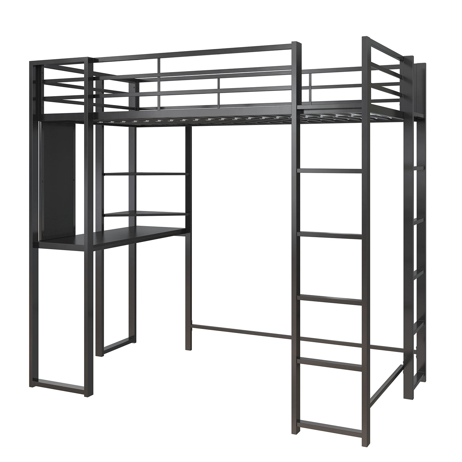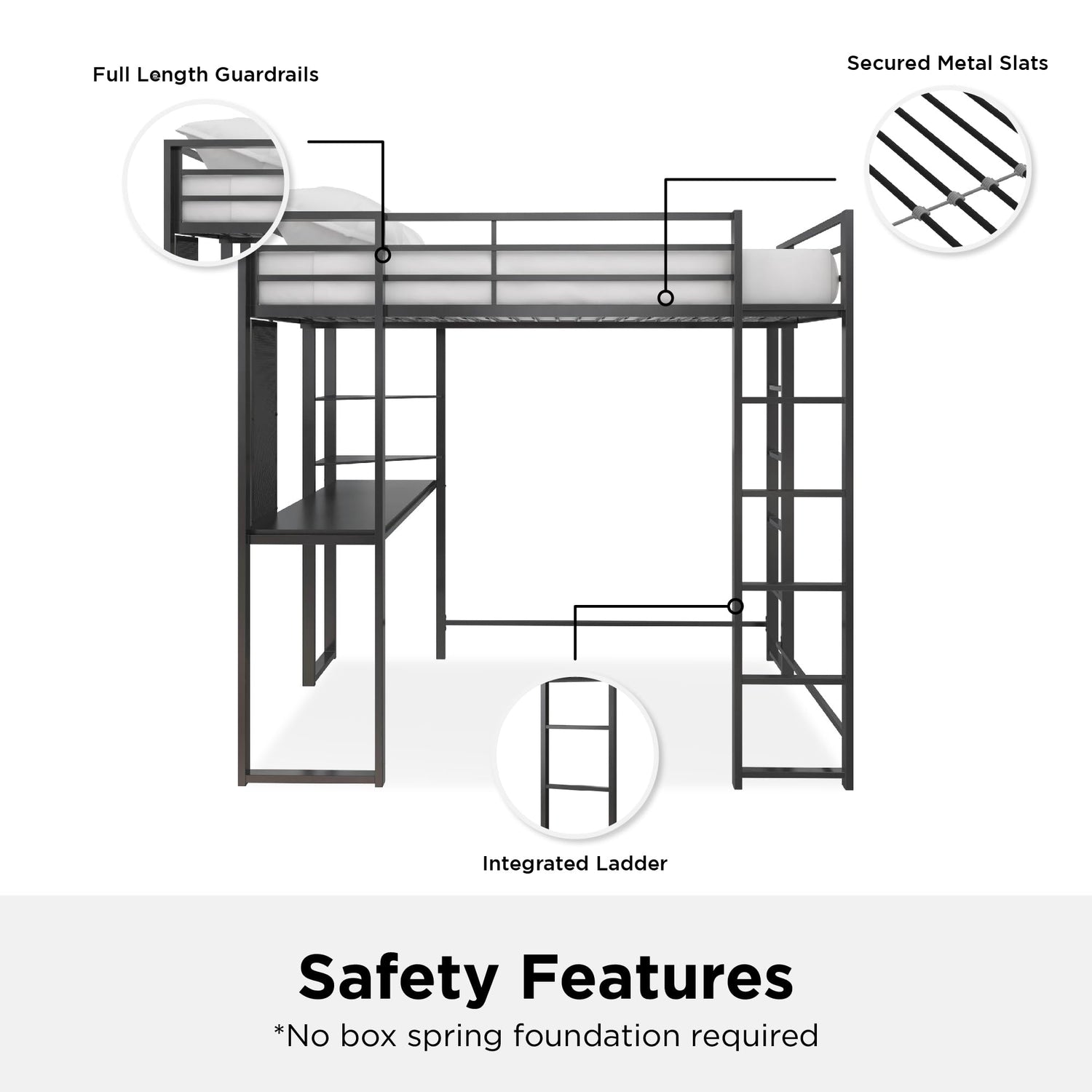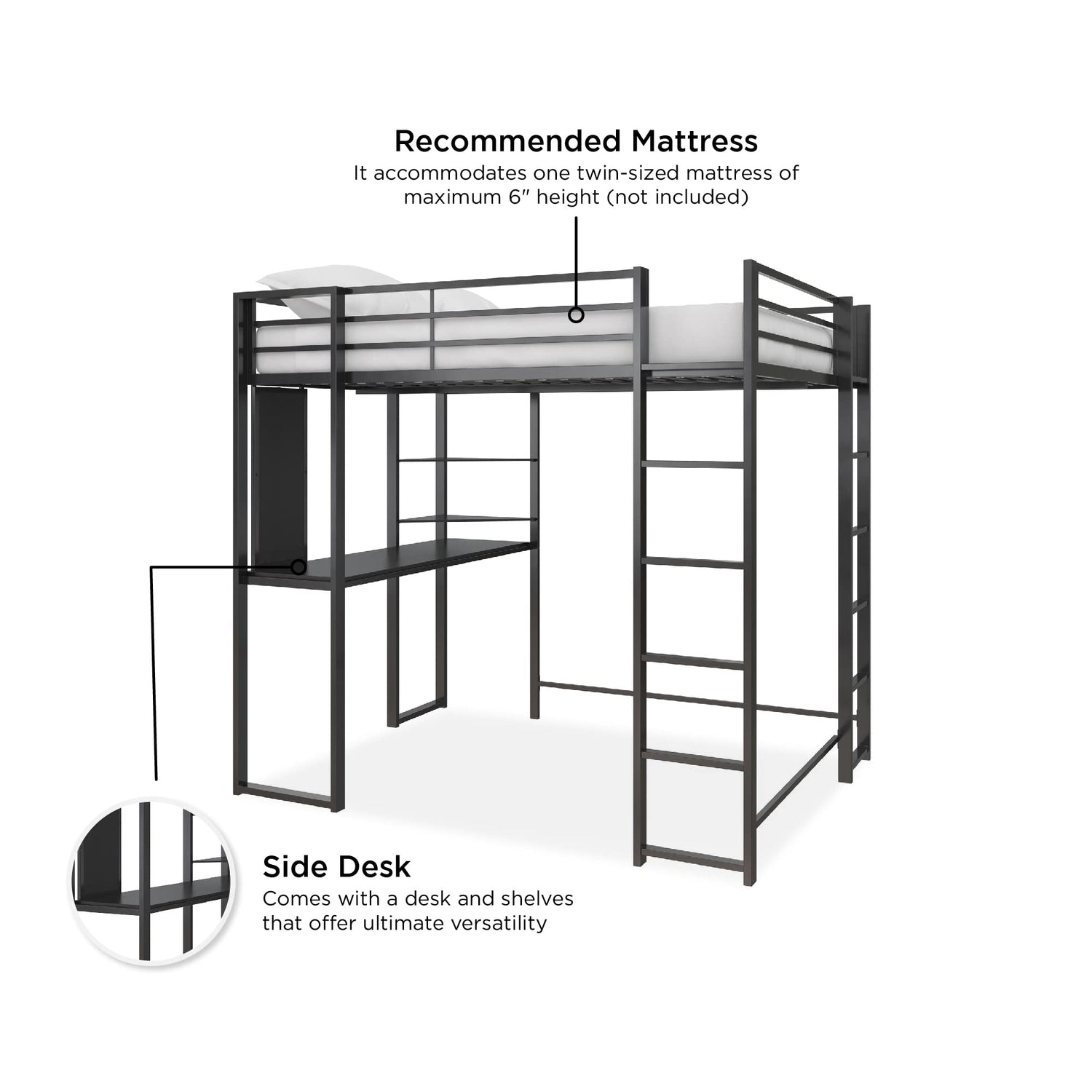 Introducing the DHP Abode Space-Saving Twin Metal Loft Bed with Desk and Shelves in a sleek black finish, designed to elevate your living space without compromising on style or functionality. This expertly crafted loft bed is perfect for smaller rooms, combining a modern aesthetic with exceptional versatility.