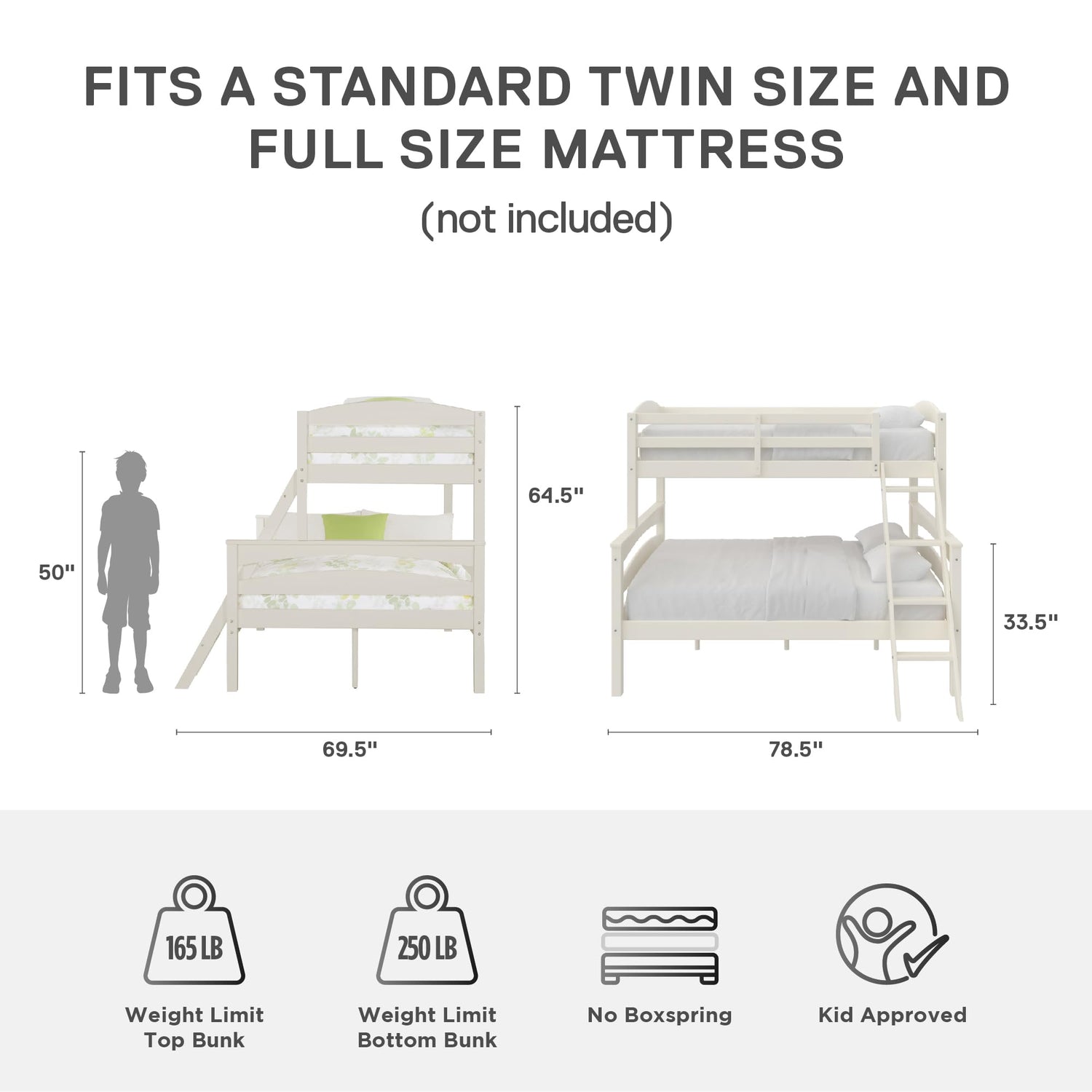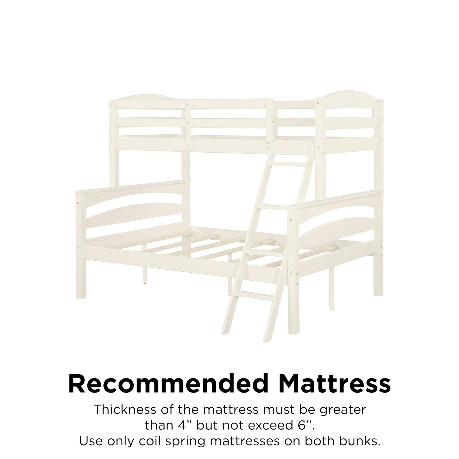- Top bed accommodates a twin mattress; bottom bed accommodates a full mattress. Only coil spring mattresses are to be used on both bunk levels; mattresses sold separately. Top bunk is designed for children ranging from 6 years of age to young teenagers.