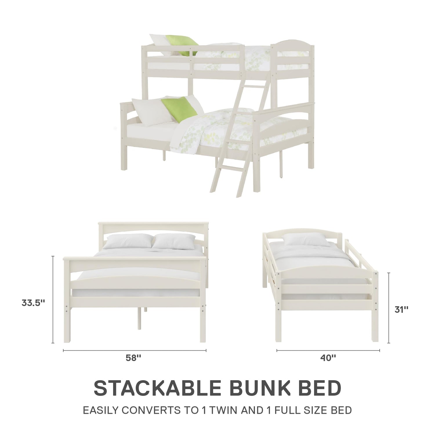 - Convertible bedroom furniture for your kids that easily converts to two stand-alone beds, 1 twin size and 1 full size.