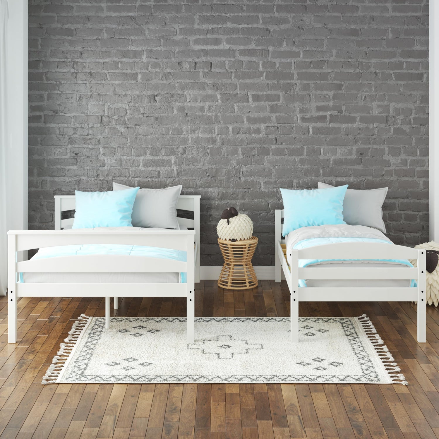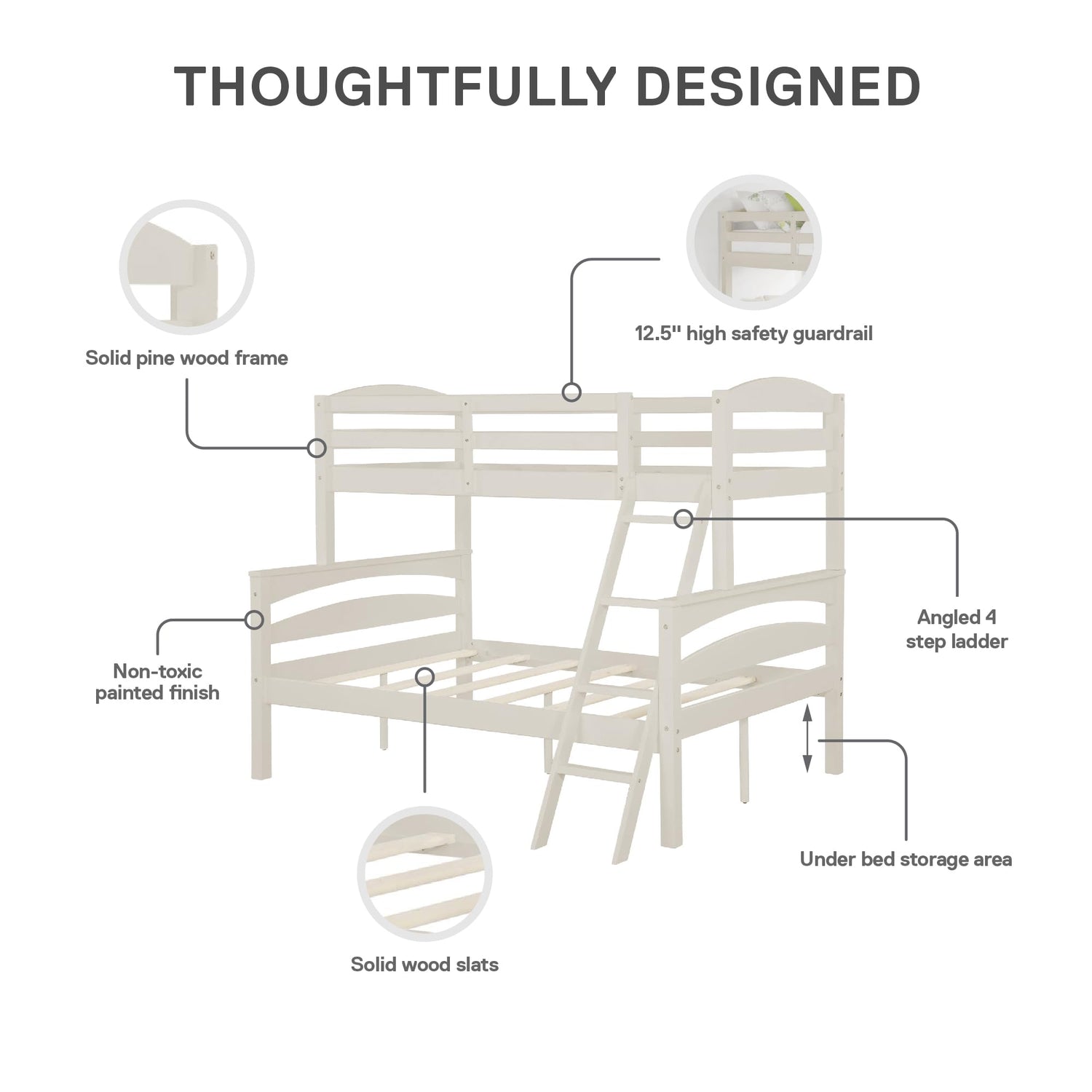 Details: The Brady Twin over Full Bunk Bed is a bedroom space saving solution that both parents and children alike will love. The practical stackable design of this bunk bed lets children have a safe and fun area to sleep, all while maximizing room space for children to play in. The Brady Bunk Bed features a solid wood construction with a 13" upper guardrail for added safety and an easy-to-climb 4-step angled ladder to reach the top bunk. What's more, support slats for both beds are conveniently included in this set and eliminate the need for any additional box spring or foundation. The DHP Brady Twin over Full Bunk Bed can also be separated and converted into two stand-alone beds for when your kids grow up and want their own space. With such versatility and durability, and with multiple color options available, the versatile Brady Twin over Full Bunk Bed is sure to suit your needs.