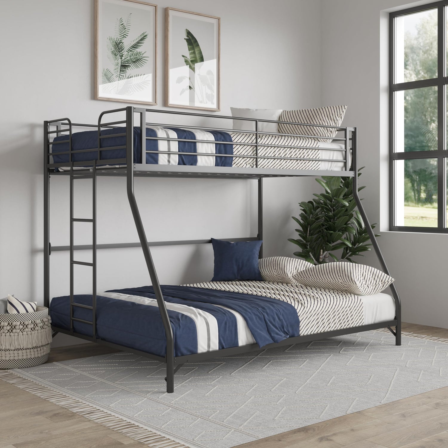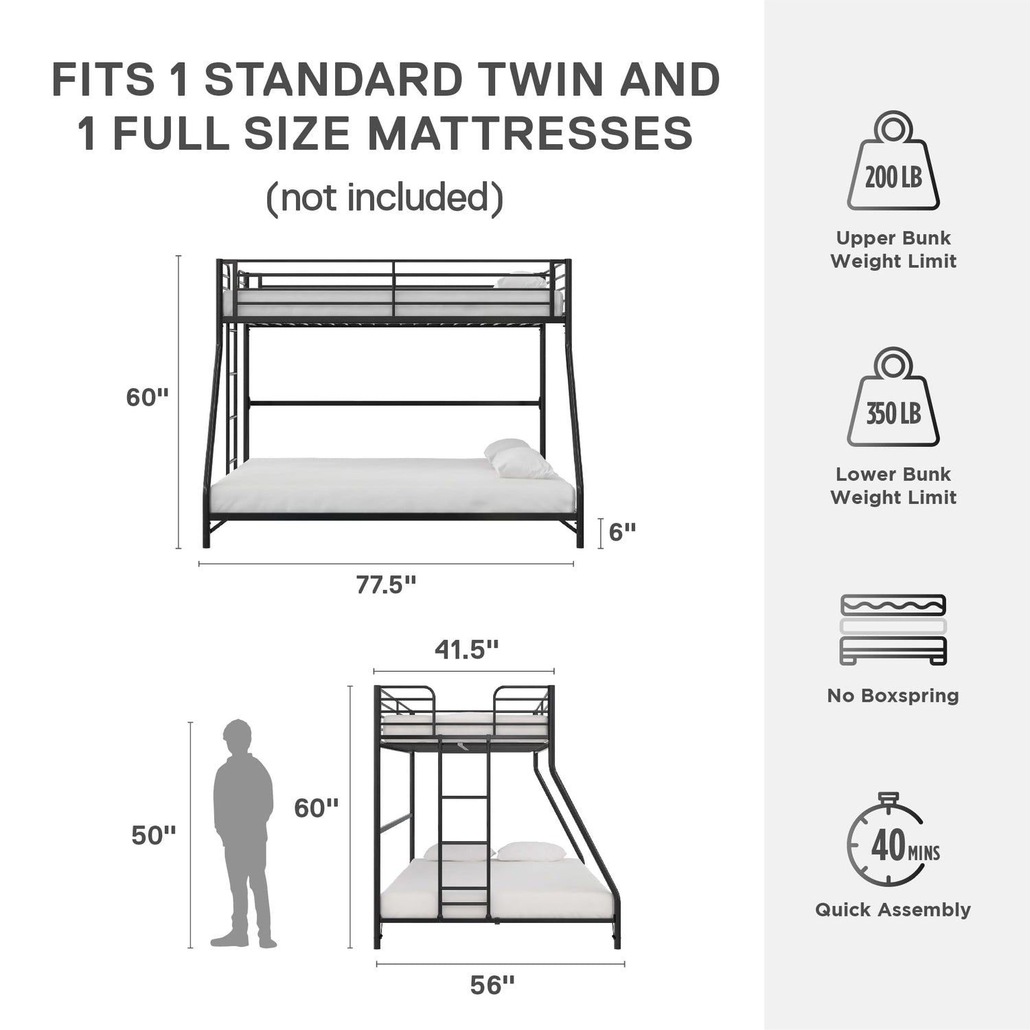 Available in Twin over Twin and Twin over Full configurations, the DHP Daven measures 77.5"L x 56"W x 60"H, and its net weight is 78.5 lbs. The upper bunk accommodates up to 200 lbs while the lower bunk supports up to 350 lbs, making it suitable for kids and teens alike.