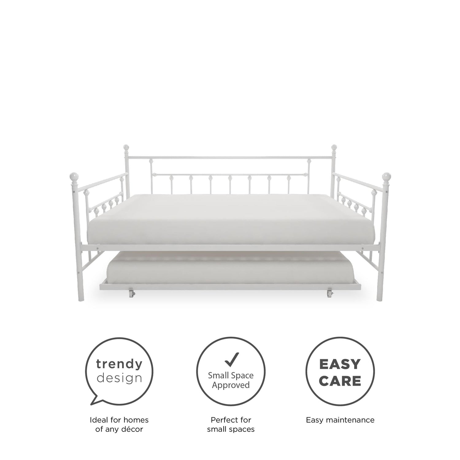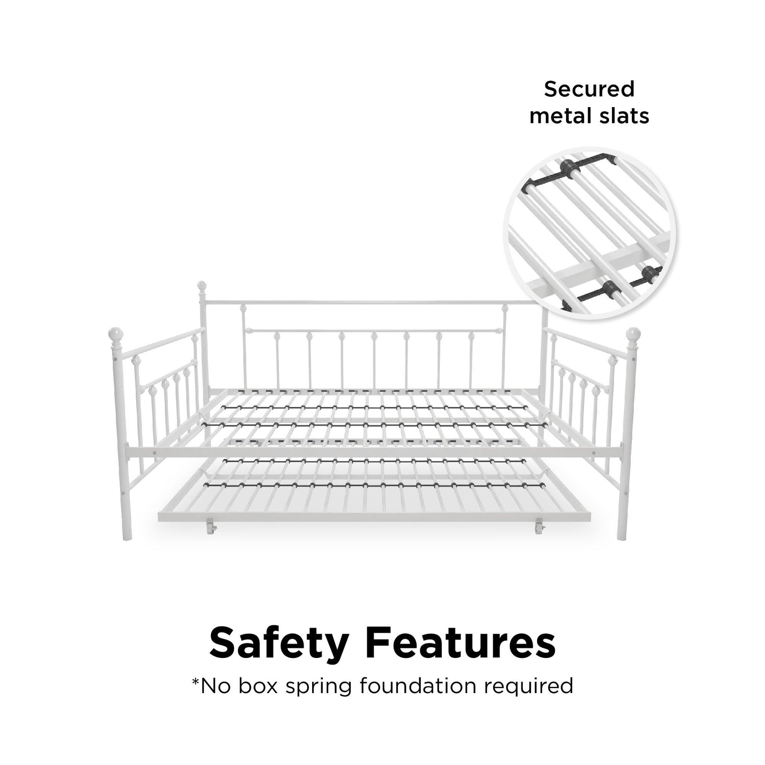- Sturdy metal frame and slats on the daybed the trundle that deliver additional support and durability. Trundle includes four (4) easy-glide casters - 2 locking and 2 non-locking.