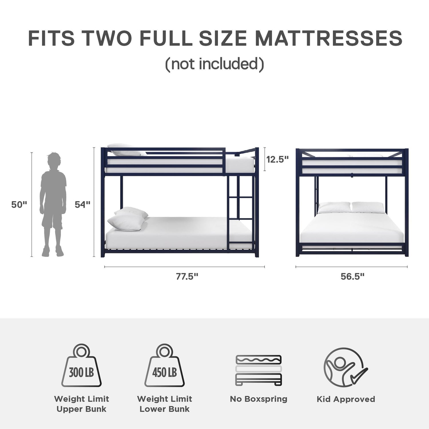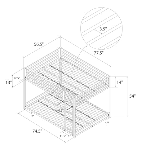 - Built for safety: The bunk bed frame incudes an integrated 3-step ladder and 12.5" guard rail for top bunk safety. Assembled dimensions: 77.5"L x 56.5"W x 54"H. Max weight limit: top bunk: 300 lbs, bottom bunk: 450 lbs.