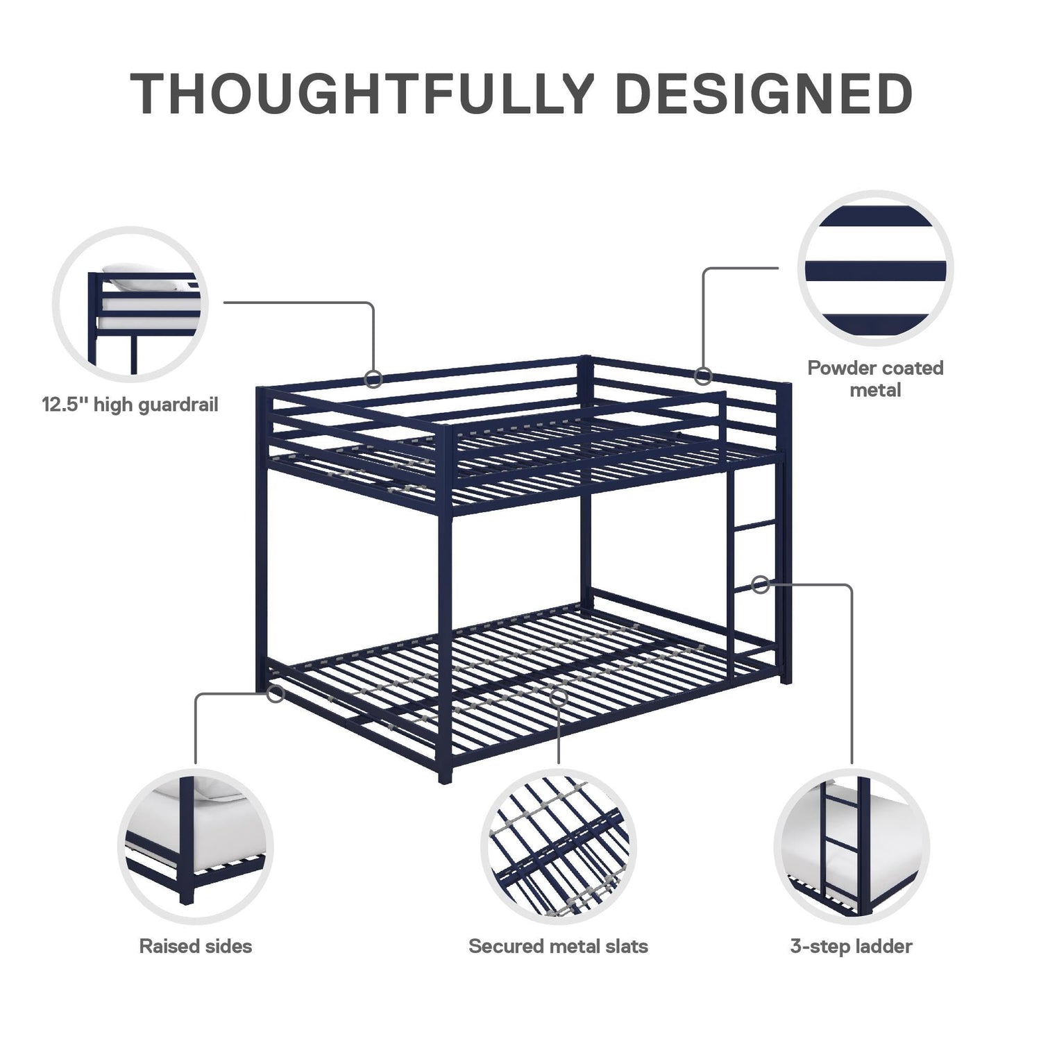 Details: The DHP Miles Full over Full Metal Bunk Bed is an all-time favorite when it comes to a space saving sleeping solution! Crafted with strong and solid metal, the Miles bunk bed introduces forms and functions to the bedroom with its streamlined silhouette. With an industrial loft appeal, this bunk bed has a lower height than the average bunk bed, making it ideal for smaller spaces. Built with your child's needs in mind, this bunk bed comes with a secured ladder that is integrated to the frame, lending a hand when it's time to hop in. The Miles also includes 12.5" full-length guardrails to ensure utmost safety for the top bunk sleeper. Both top and lower bunk, include secured metal slats fully support mattress and sleeper without requiring an additional foundation; what's more, the slats allow for better air circulation for your mattresses, making it last longer. This compact and space-friendly bunk bed is designed to be a great sleeping companion for children, teenagers and adults as it comes in various size combinations that suit every need out there. Here is to a well-made bunk bed!
