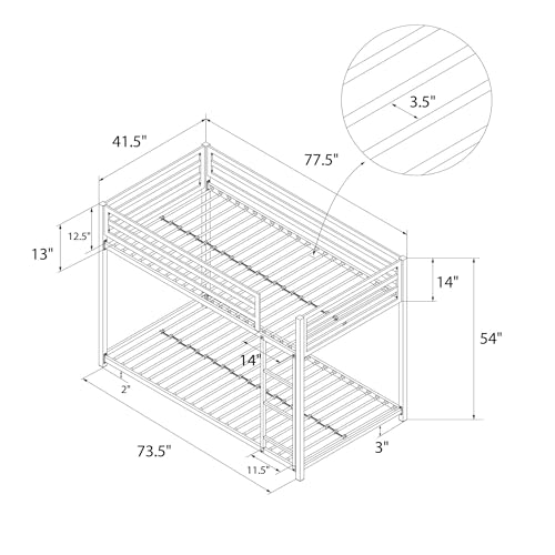 - Built for safety: The bunk bed frame incudes an integrated 3-step ladder and 12.5" guard rail for top bunk safety. Assembled dimensions: 77.5"L x 41.5"W x 54"H. Max weight limit: top bunk: 200 lbs, bottom bunk: 250 lbs.