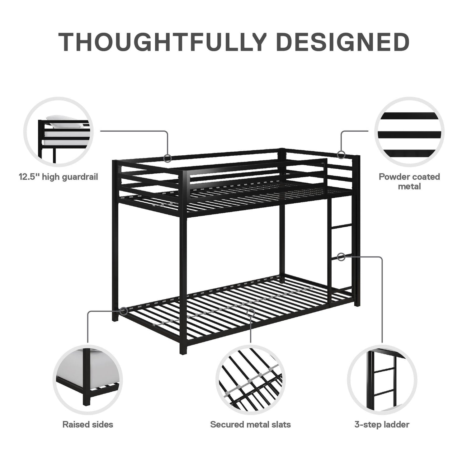 Details: The DHP Miles Twin over Twin Metal Bunk Bed is an all-time favorite when it comes to a space saving sleeping solution! Crafted with strong and solid metal, the Miles bunk bed introduces forms and functions to the bedroom with its streamlined silhouette. With an industrial loft appeal, this bunk bed has a lower height than the average bunk bed, making it ideal for smaller spaces. Built with your child's needs in mind, this bunk bed comes with a secured ladder that is integrated to the frame, lending a hand when it's time to hop in. The Miles also includes 12.5" full-length guardrails to ensure utmost safety for the top bunk sleeper. Both top and lower bunk, include secured metal slats fully support mattress and sleeper without requiring an additional foundation; what's more, the slats allow for better air circulation for your mattresses, making it last longer. This compact and space-friendly bunk bed is designed to be a great sleeping companion for children, teenagers and adults as it comes in various size combinations that suit every need out there. Here is to a well-made bunk bed!