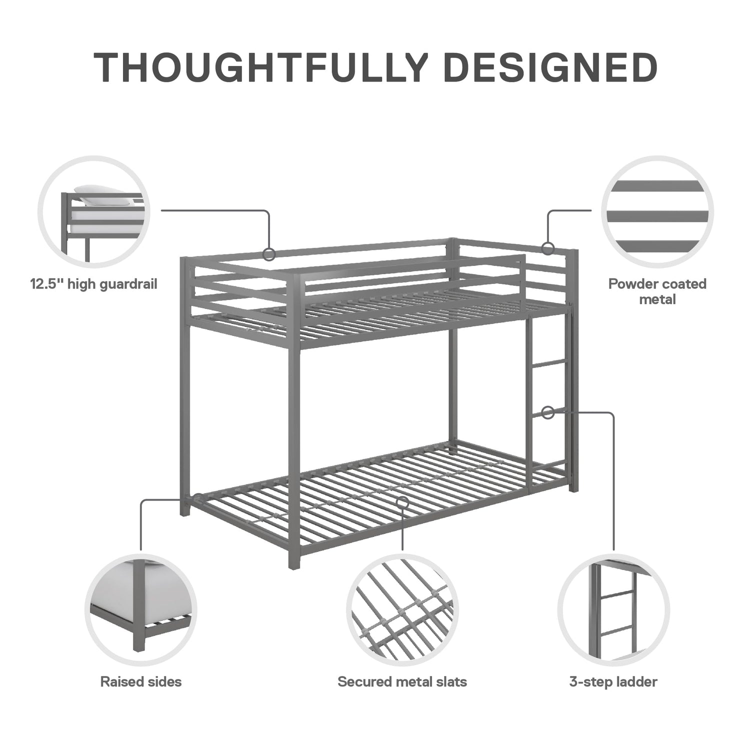 DHP Miles Silver Low Metal Bunk Bed Frame for Kids - Twin Over Twin with Built-in Ladder and High Guardrails