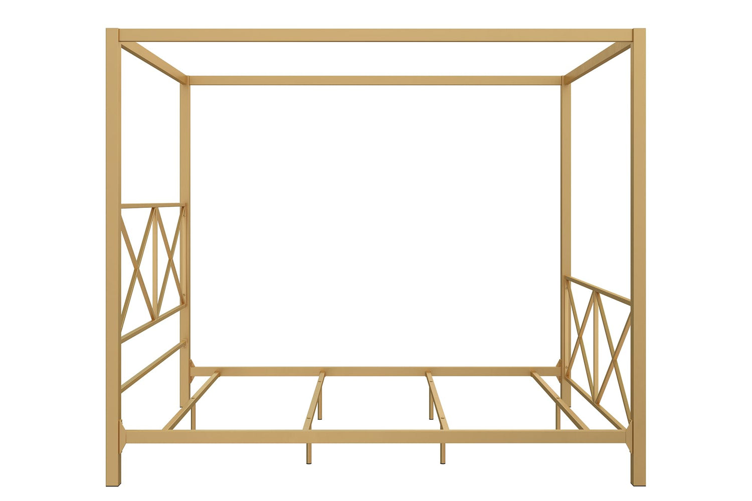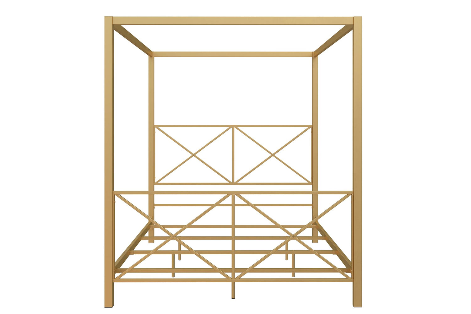 DHP Rosedale Metal Canopy Bed Frame with Four Poster Design and Geometric Accented Headboard and Footboard, Underbed Storage Space, Queen, Gold