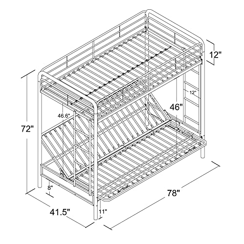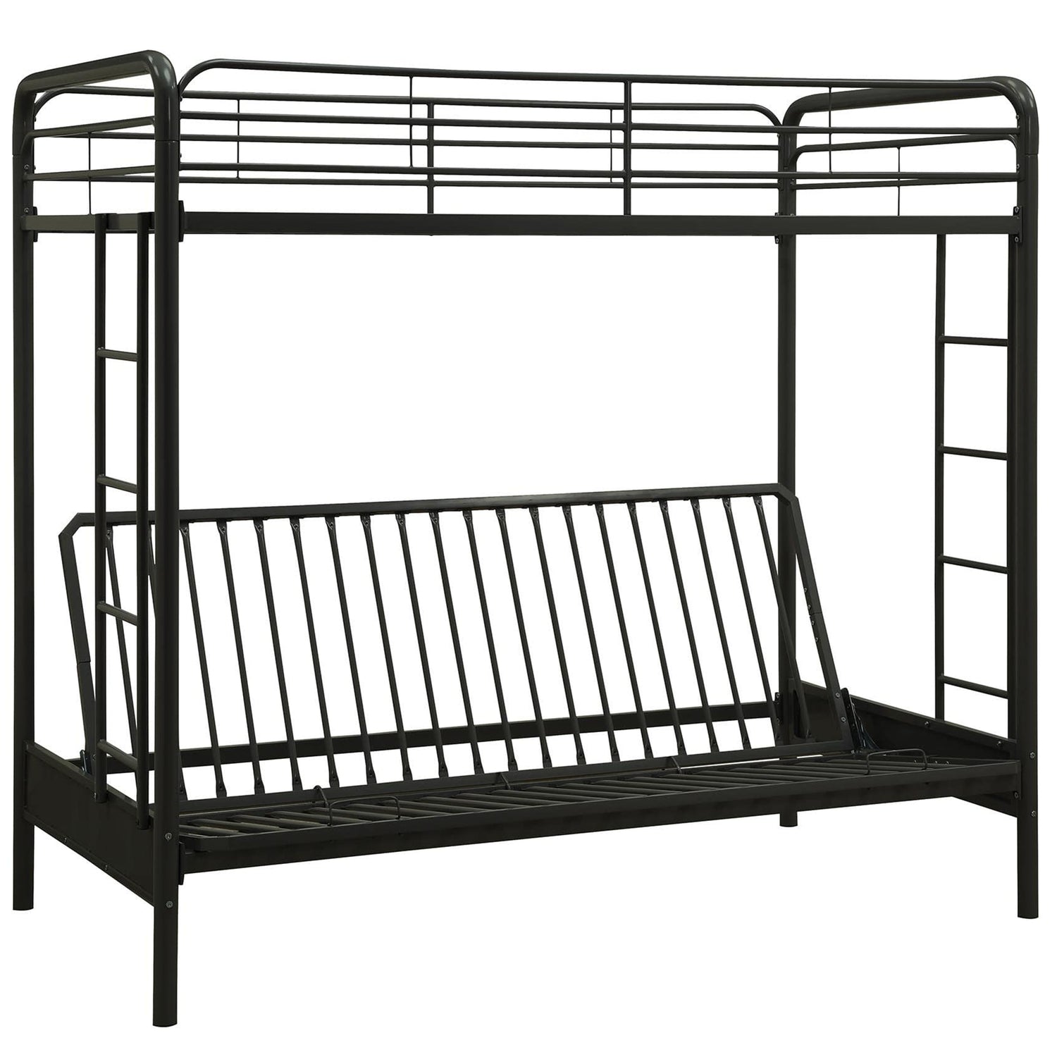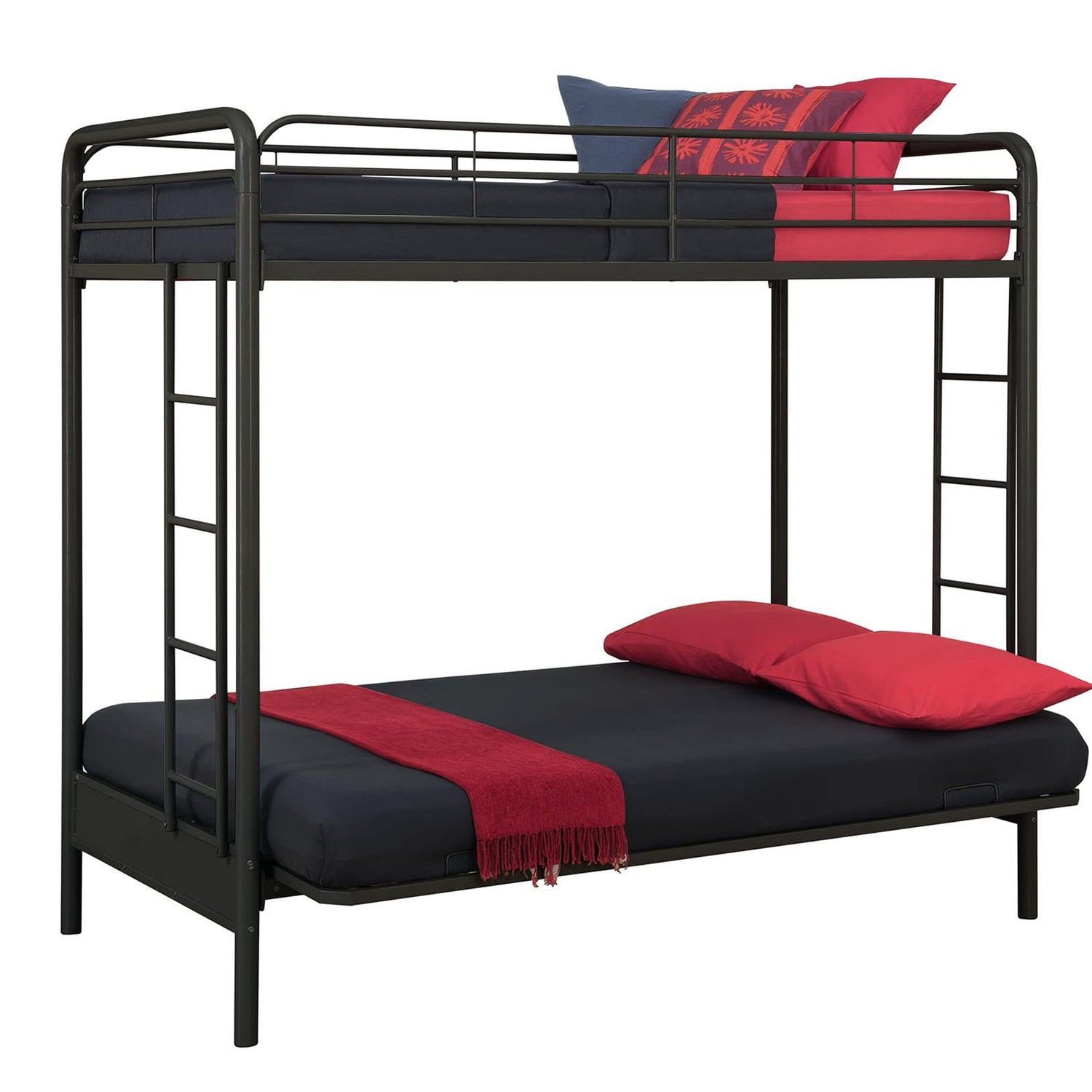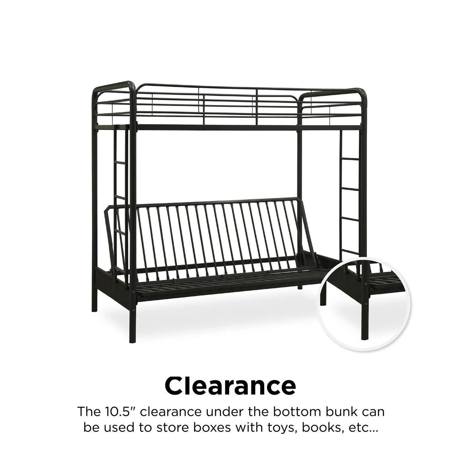 Details: The simple style and stability of DHP's Twin-Over-Futon Bunk Bed make it the perfect choice for space-saving sleep options. The black metal finish will look good with any décor and the frame is solid and secure. Added safety features include a full-size guardrail for the top bunk, childproof mechanism and an integrated ladder. With the futon on the bottom, you have the versatility of either having a seating space to relax or an additional bed for overnight guests, siblings and sleep-overs. You will love the convenience, flexibility and changeability of DHP's Twin-Over-Futon Bunk Bed in black, white or silver. Mattress and futon mattress are sold separately.