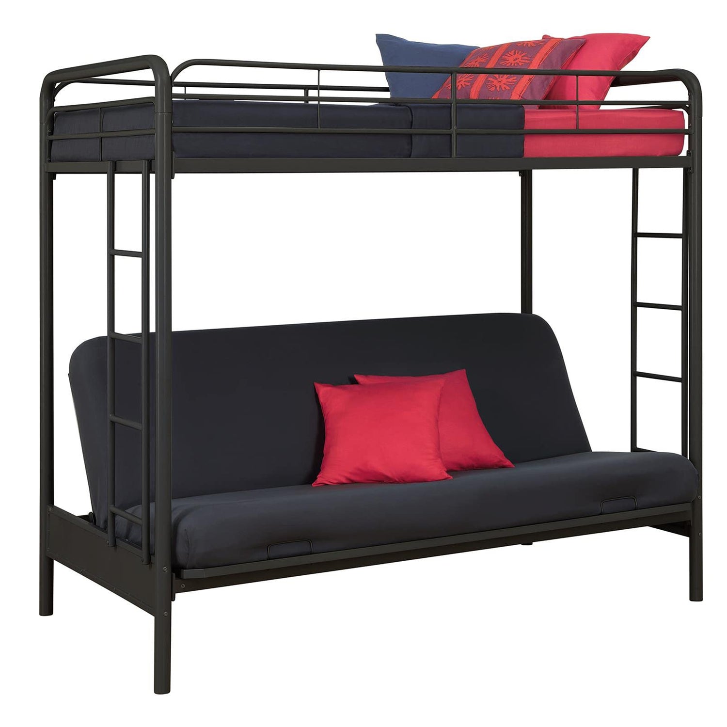 - Multi-functional metal bunk bed over convertible futon couch design. Bottom bunk can be used as a sofa or a full size bed. Perfect for kids bedrooms, dorm rooms, teens rooms or guest rooms. Futon quickly, easily and safely converts into a full size sleeper