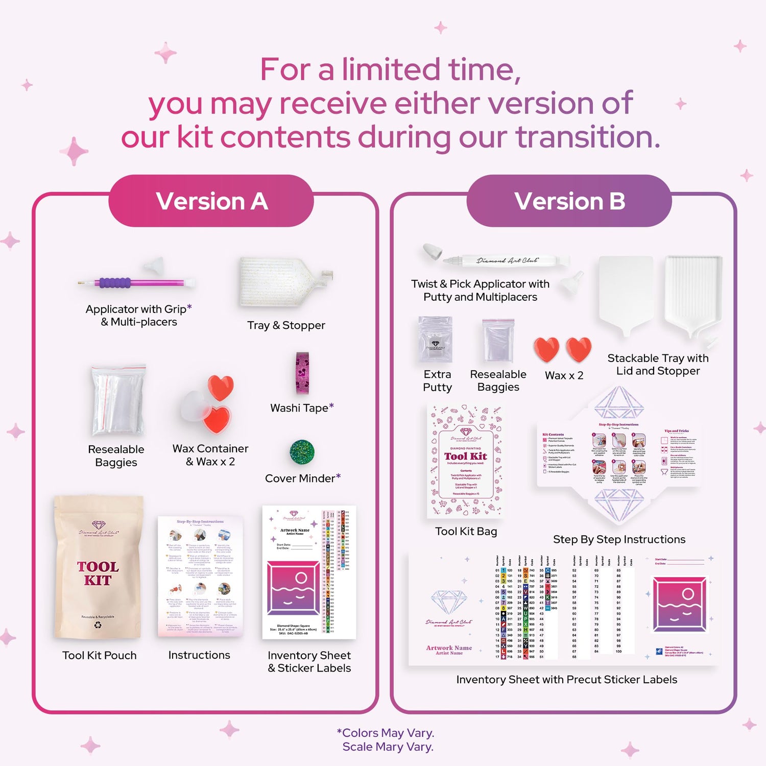 - INCLUDED: A 15" x 13" (38.1 x 32.8 cm) full-drill canvas, round diamonds in 26 colors with 2 aurora borealis diamonds and 2 fairy dust diamonds, 1 applicator with grip, 2 multi-placers, 1 cover minder, 1 tray with stopper, 1 wax container, 2 wax pads, washi tape, resealable baggies, sticker labels, and instructions. Diamond count: 15,912.