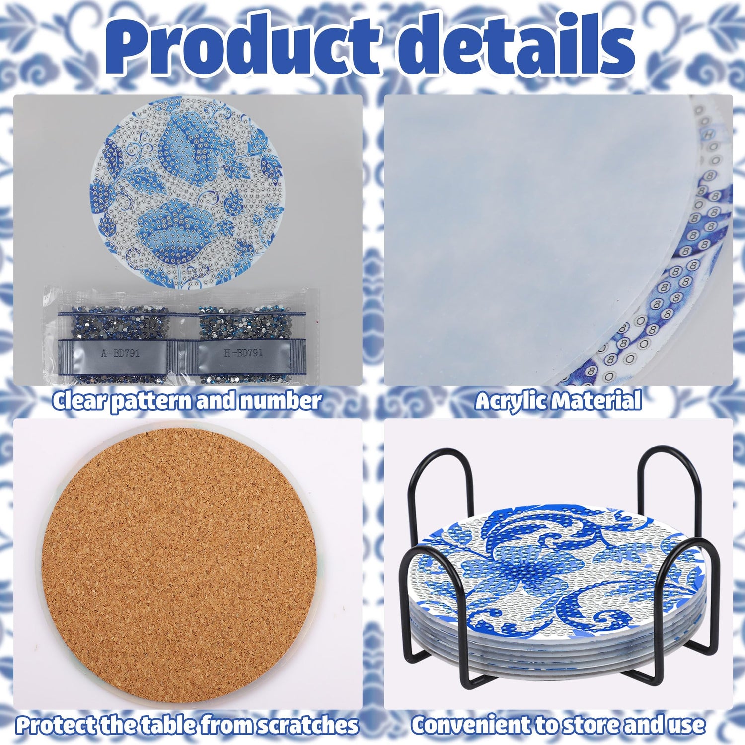 - Package Include: you will get 8 blue floral coasters, 8 cork bases, 1 metal holder, a set of diamond painting tools, and a sufficient number of rhinestones. DIY 5D diamond coasters are perfect for DIY enthusiasts and bring you a lot of fun! You can place the coasters on the kitchen table and tea table.