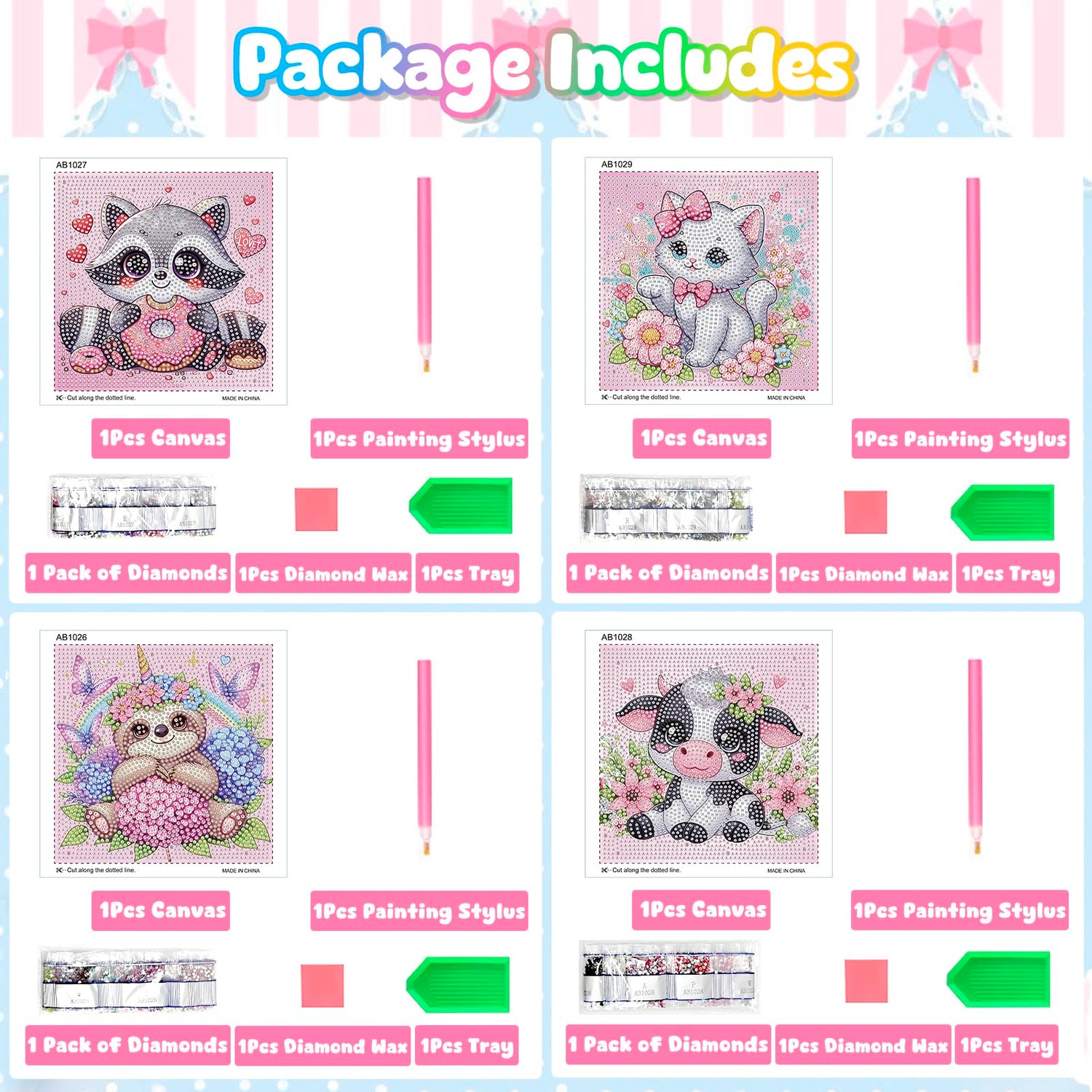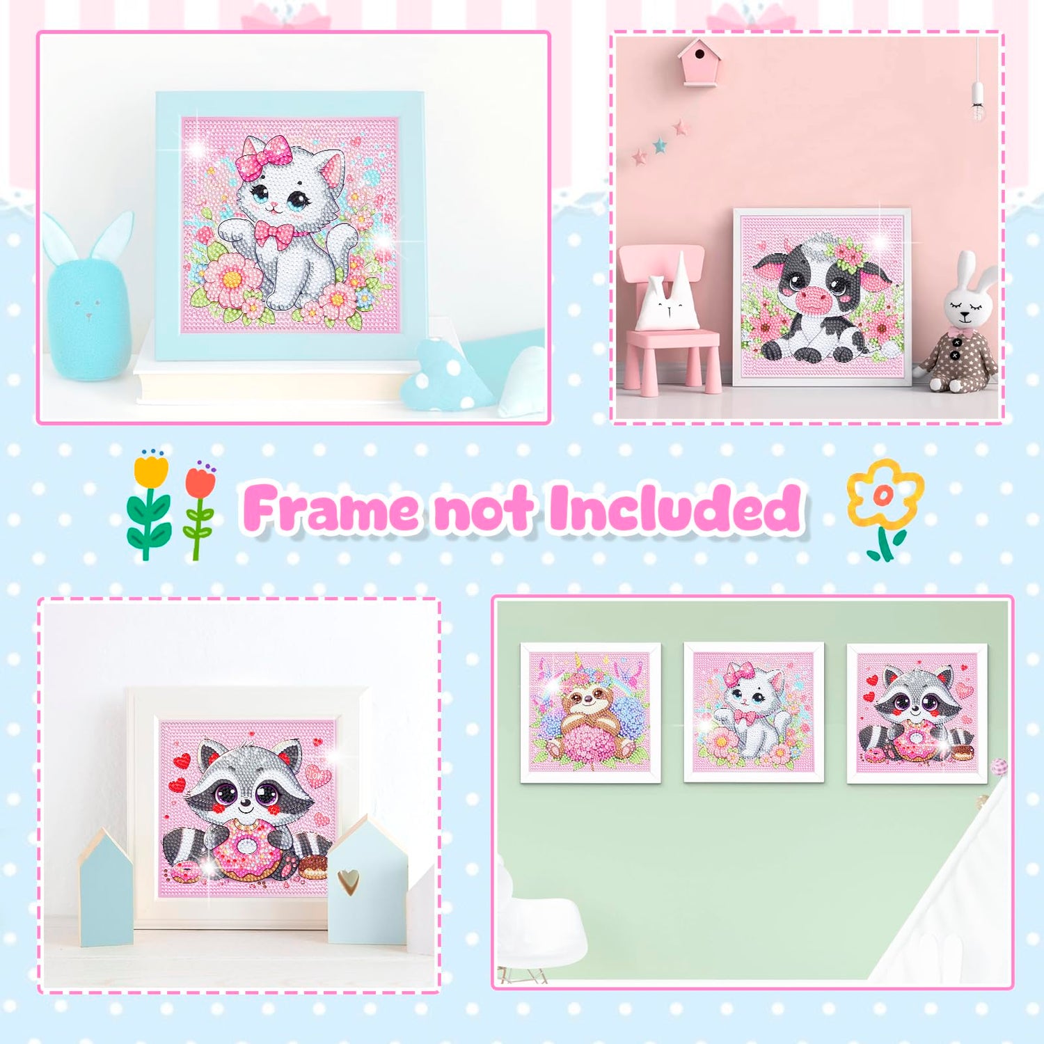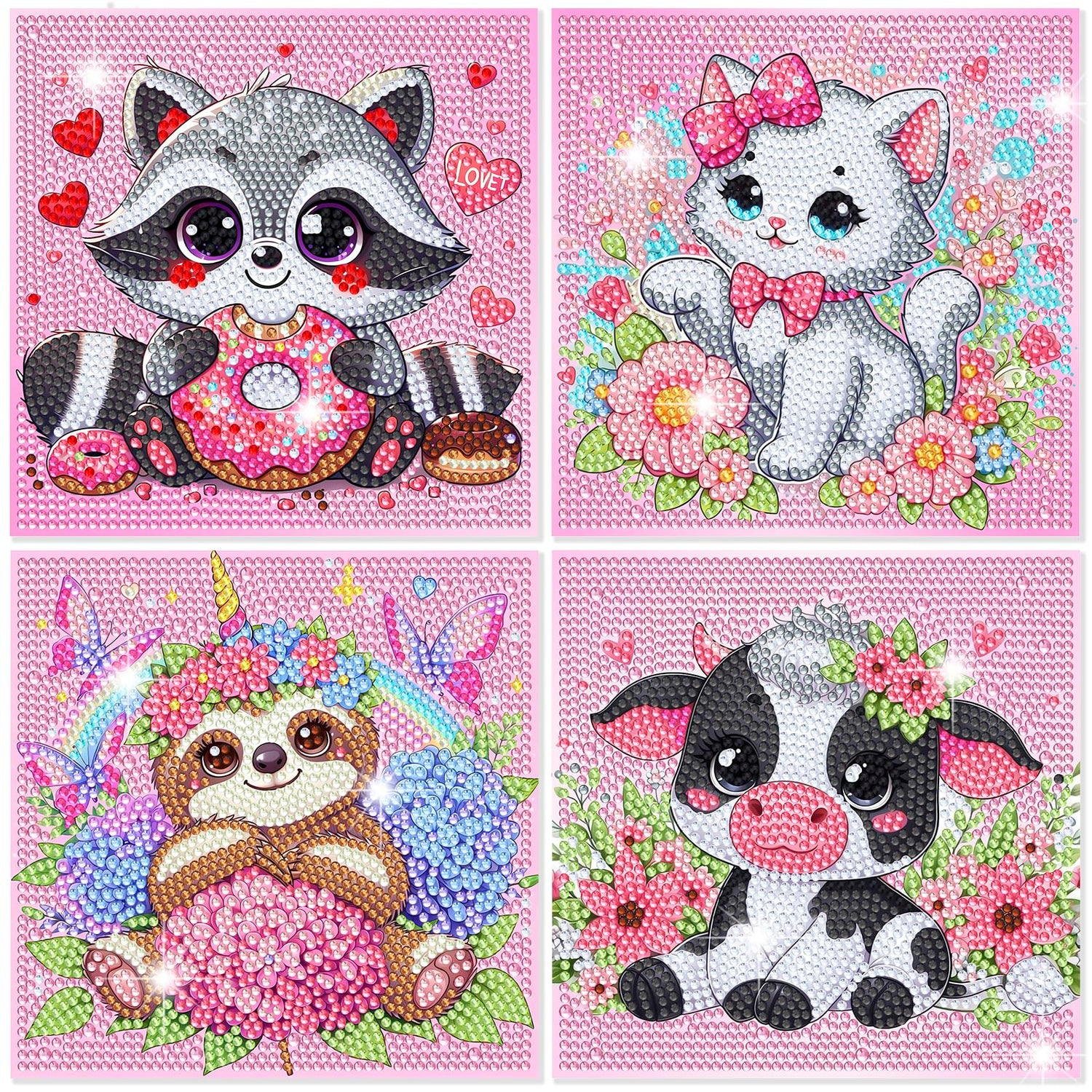 Diamond Art Kits for Kids, 4 Pieces Cartoon Animals Diamond Painting Kits for Adults Beginner, 5D Full Round Drill Gem Art Arts and Crafts for Kid Mosaic Kits for Gift Home Wall Decor Kids 6X6 inch