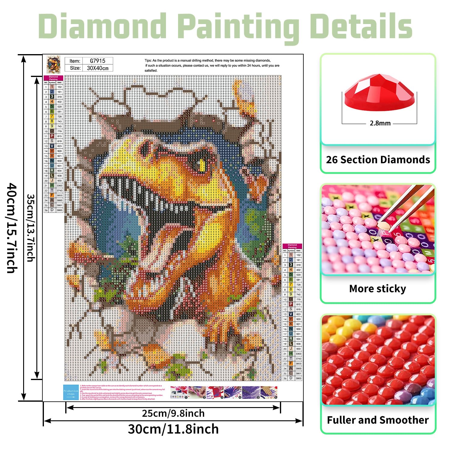 - 【What Will You Get ?】 Our dinosaur diamond painting kit for adults comes with everything you need to begin: waterproof canvas*1, drill pen*1, replacement pen head*2, glue block*2, tray*1, ziplock bag*30, and more than 30% of coloured round diamonds.
